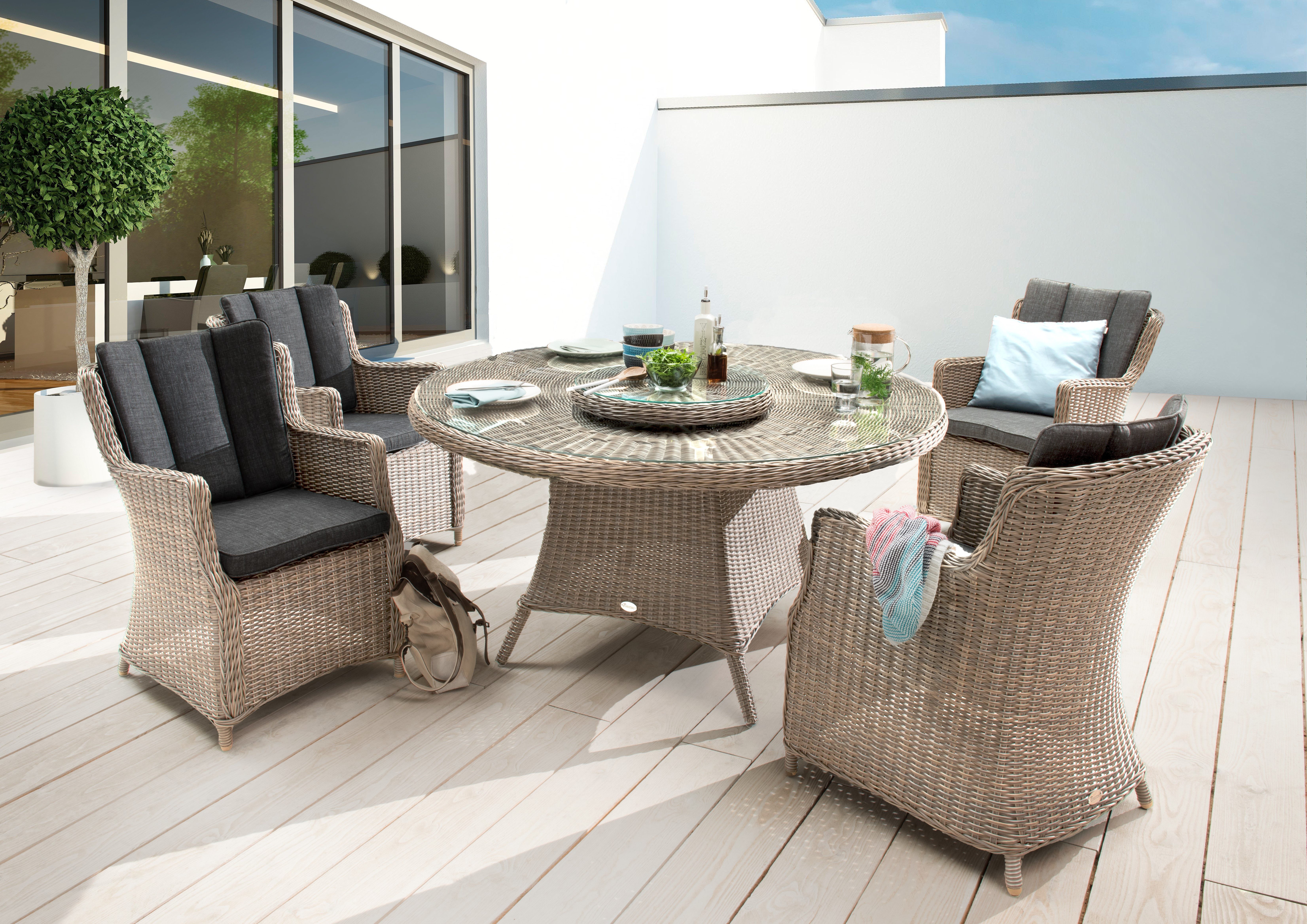 Lieferumfang | 1 Drehteller 1 Tisch 4 Sessel 8 Auflagen |