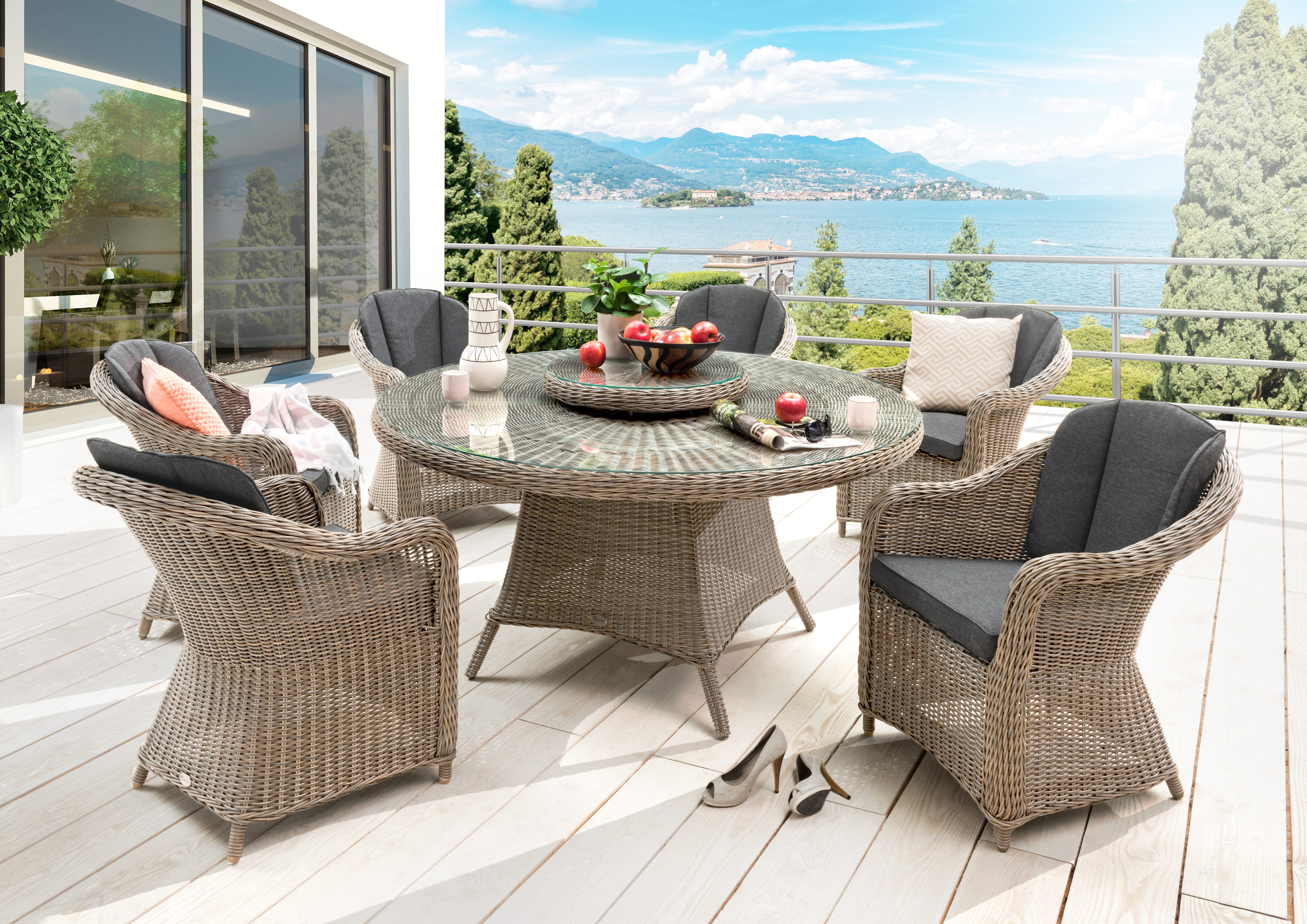 Set beinhaltet | 6x Sessel, 1x Tisch, 1x Drehteller, Polstersatz |