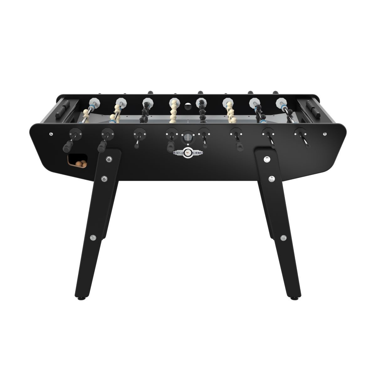 Stabiler Tischkicker für den Innenbereich Der Deutscher Meister Tischkicker "Primaline" ist ein hochwertiges Modell, das für den intensiven Einsatz in Jugendräumen, Schulen, Vereinsheimen und anderen Einrichtungen entwickelt wurde. Der Tischkorpus besteht aus robustem Mehrschichtholz mit einer kratz- und stoßfesten HPL-Beschichtung, was eine lange Lebensdauer und hohe Widerstandsfähigkeit sicherstellt. Mit seinem klassischen Schwarz-in-Schwarz-Design fügt sich dieser Kicker schön in verschiedene Umgebungen ein und lässt sich leicht reinigen. Die abgerundeten Ecken des Kickers verleihen diesem Modell einen besonders hochwertige Look und machen Ihn zu einem echten Hingucker. Benutzerfreundlich und komfortabel Ausgestattet mit 16 mm starken, verchromten Spielstangen und ergonomischen Softgrip-Griffen bietet der Primaline Tischkicker ein angenehmes Spielerlebnis. Die Stangen laufen in hochwertigen Gleitlagern, was für flüssige Bewegungen sorgt, während die robusten, geschraubten Figuren dank der Federn zur Korpuswand hin gedämpft werden. Die Ballentnahme erfolgt unkompliziert von beiden Seiten des Tisches, und mit einer Griffhöhe von 84 cm ist der Kicker für Spieler verschiedener Körpergrößen gut geeignet. Zudem ist der Tisch vormontiert und kann mit der beiliegenden Anleitung einfach fertig aufgebaut werden. Technische Details und Materialien Der 28 mm starke MDF-Korpus mit HPL-Beschichtung sorgt für Stabilität und Langlebigkeit. Die Tischbeine aus massiver Vollholz-Eiche mit einer Breite von 35 mm bieten festen Stand, während die rutschfesten Höhenversteller Bodenunebenheiten ausgleichen. Das Spielfeld hat eine Размер von 120 x 70 cm und verfügt über eine Melamin-Oberfläche, die präzise und schnelle Ballbewegungen ermöglicht. Die nahtlos hochgezogenen Spielfeldecken und der 360° rotierende Torwart komplettieren das Spielerlebnis. Zum Lieferumfang gehören 10 weiße Kickerbälle.