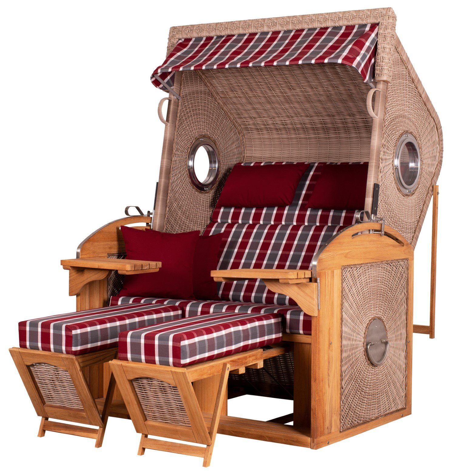 Der Strandkorb Sailor XL bietet ausreichend Platz für zwei Personen und verfügt über einen mehrfach verstellbaren Oberkorb und zwei weich gepolsterte Fußstützen, um Ihren Komfort zu maximieren. Mit den beiden großen Schwenktischen haben Sie immer einen kleinen Snack oder ein kühles Getränk in Reichweite.