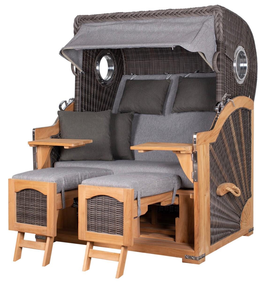 Als Familien-Strandkorb eignet sich der Seemöwe XL sowohl für den Garten als auch auf dem Balkon oder einer Terrasse. Der deVries PURE® Strandkorb wird aus hellem Teakholz gefertigt und hat einen verstellbaren Oberkorb, welcher außen und innen von wetterfestem PE-Geflecht in der Farbe stone grey umgeben ist. In das Geflecht ist eine transparente Schutzfolie integriert.