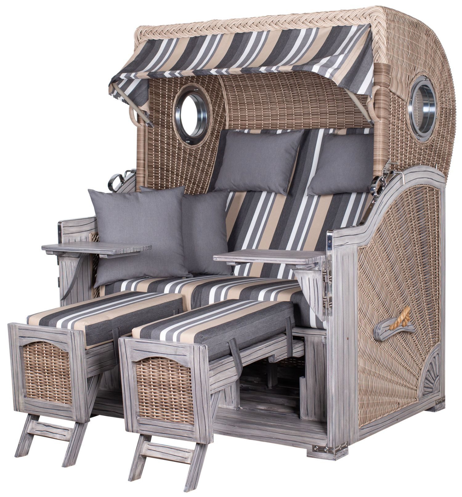 Lackiertes Mahagoniholz für den perfekten Vintage-LookEntdecken Sie zeitlose Eleganz und höchsten Komfort mit diesem exquisiten Strandkorb im Vintage-Look. Ein Meisterwerk aus grau lackiertem Mahagoniholz, das jede Umgebung mit seinem edlen Charme veredelt. Markenzeichen bei den deVries-Strandkörben ist das auch im Innenkorb verarbeitete PE-Rattangeflecht - hier in der Farbe white kubu.