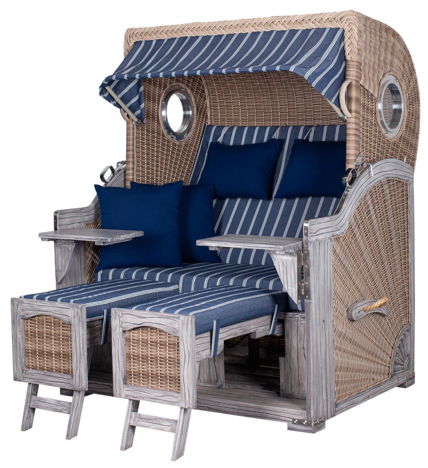 Liebe zum DetailDiese zeigt sich in jedem Element dieses Strandkorbs. Aluminium-Bullaugen fangen das schimmernde Sonnenlicht ein und verleihen dem Vintage-Look einen Hauch von maritimer Romantik. Die bei diesem Modell bereits eingebauten Rückholfedern ermöglichen es Ihnen, mühelos die perfekte Position zu finden – lehnen Sie sich zurück, schließen die Augen und genieße Sie Ihre Auszeit vom Alltag.