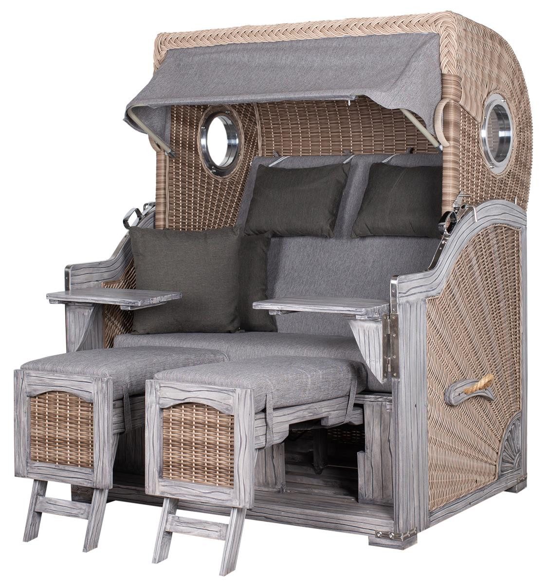 Lackiertes Mahagoniholz für den perfekten Vintage-LookEntdecken Sie zeitlose Eleganz und höchsten Komfort mit diesem exquisiten Strandkorb im Vintage-Look. Ein Meisterwerk aus grau lackiertem Mahagoniholz, das jede Umgebung mit seinem edlen Charme veredelt. Markenzeigen bei den deVries-Strandkörben ist das auch im Innenkorb verarbeitete PE-Rattangeflecht - hier in der Farbe white kubu.
