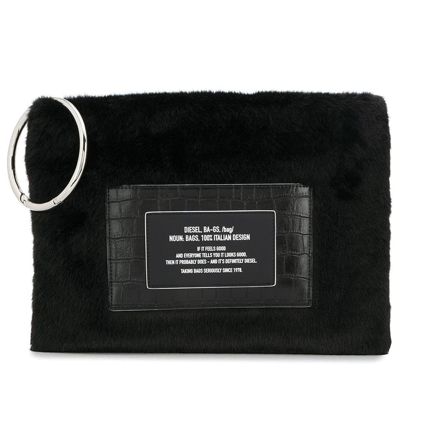 Diese Clutch aus Kunstpelz verfügt über eine Vordertasche in Kroko-Optik mit Logoapplikation, die von Wörterbuchdefinitionen inspiriert wurde.