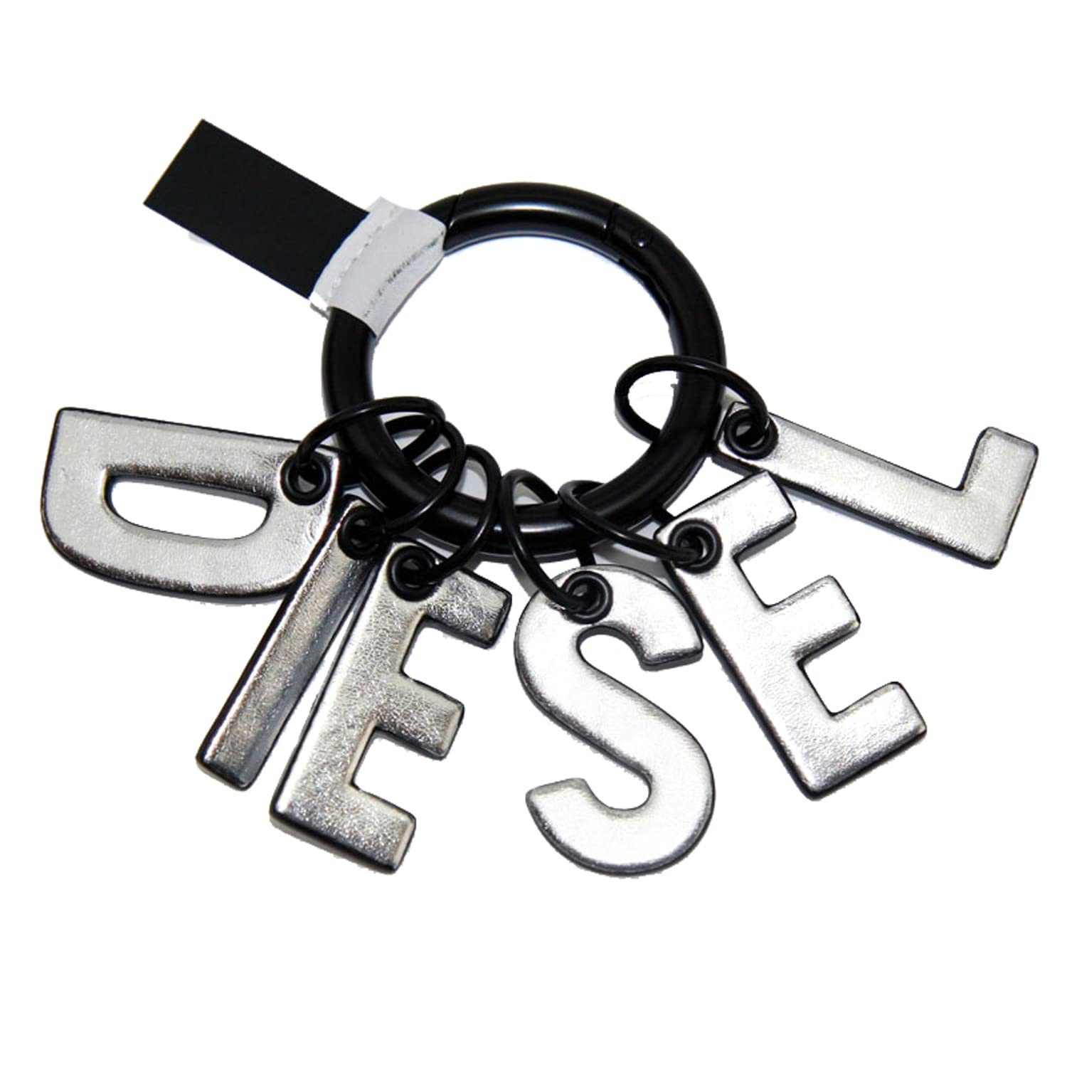 Dieser Schlüsselanhänger verfügt über Charms mit Diesel-Schriftzug, die in Polyurethan mit Metallic-Finish eingeschlossen sind.