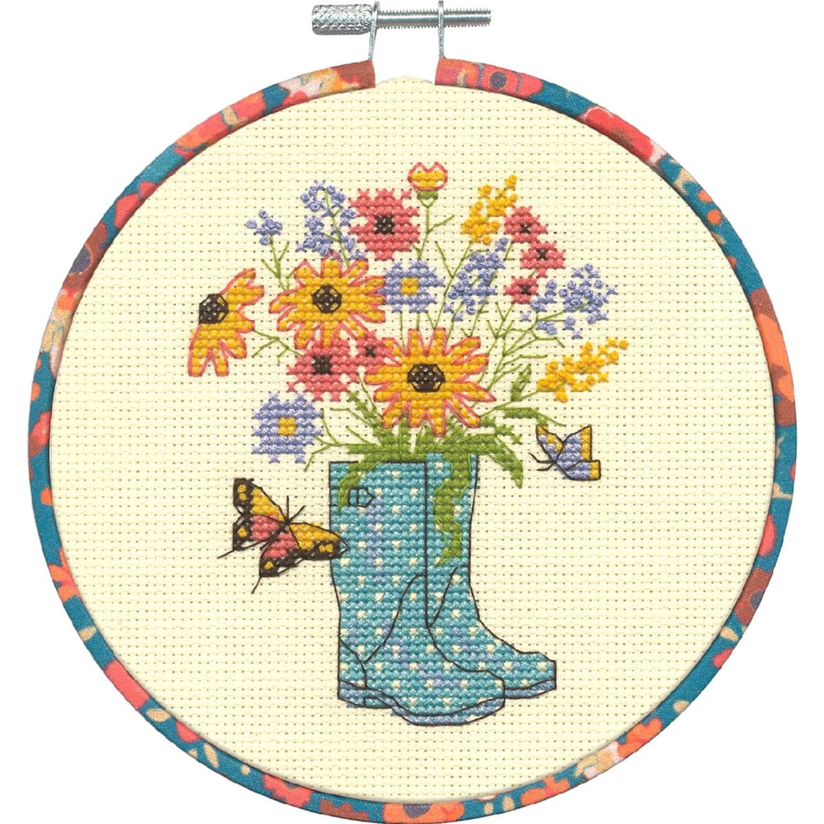 Dimensions Kreuzstich Stickpackung mit Zählmuster und Stickrahmen "Blumenstiefel"