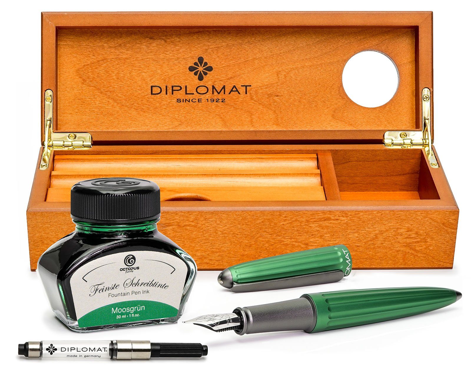 EIN EXKLUSIVES GESCHENKSET für Freunde des edlen Schreibens: der innovative Füllhalter Aero von Diplomat in grün mit passender Füllhaltertinte "Mossgrün" von Octopus Fluids (30 ml)