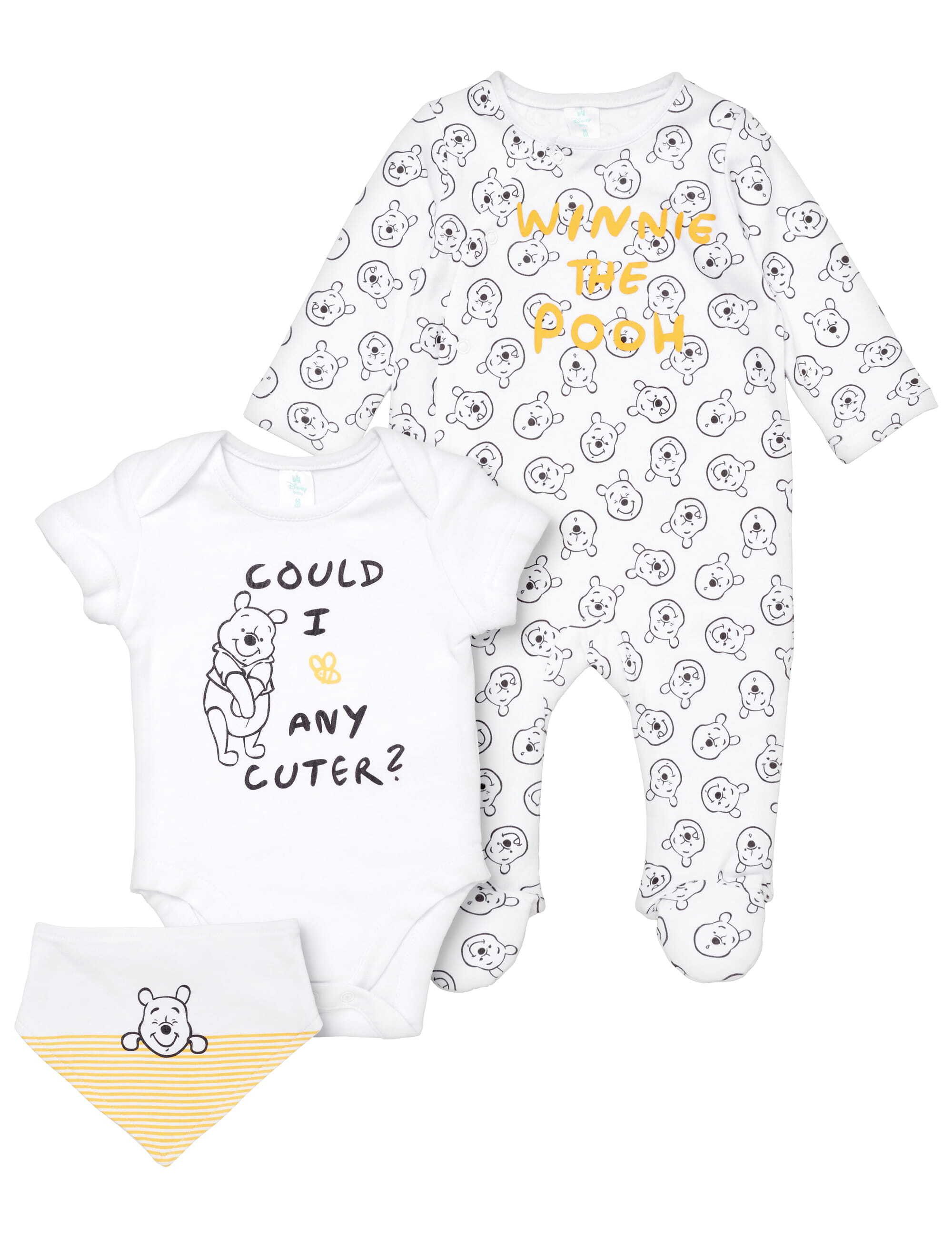 Dieses bezaubernde Set beeindruckt durch seine herausragende Qualität und das besonders weiche Material, das für optimale Atmungsaktivität, eine hervorragende Passform und angenehmen Tragekomfort sorgt. Dein Baby wird sich darin rundum wohl und geborgen fühlen. Das liebevolle Design und der moderne Materialmix machen dieses Set zu etwas ganz Besonderem. Der kurzärmelige Body mit niedlichem Bären-Print und dem frechen Spruch „Could I be any cuter?“ bringt Humor und Charme ins Baby-Outfit. Der langärmelige Strampler mit Allover-Motiv und leuchtendem Schriftzug sorgt für einen fröhlichen Look. Das passende Halstuch mit kleinem Bärenmotiv rundet das Set perfekt ab. Ein liebevoll gestaltetes Outfit aus weichen Materialien – ideal für kleine Fans. Auch werden Eltern und Kind das durchdachte Design gleichermaßen schätzen, denn dank der praktischen Anordnung der Druckknöpfe und der elastischen Bündchen wird das An- und Ausziehen erleichtert, und das Wickeln wird zum Kinderspiel. Dieses Set ist auch eine wunderbare Geschenkidee zur Geburt. (C02158-001)