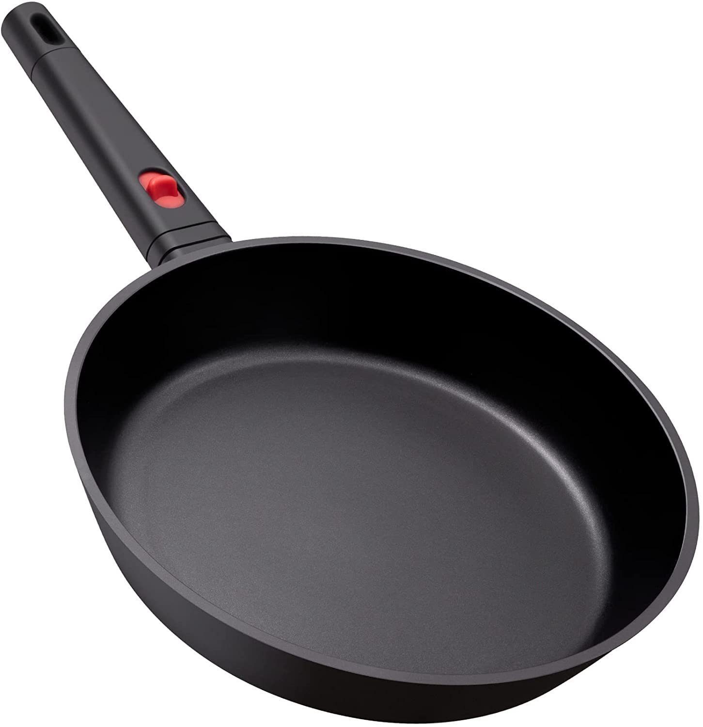Die Bratpfanne 24 cm bietet eine schnelle und gleichmäßige Wärmeverteilung dank ihres hochwertigen geschmiedeten Aluminiumgehäuses. Sie ist kompatibel mit Gas-, Induktionsherd & E-Herd. Der abnehmbare Griff spart viel Stauraum und verhindert Verbrennungen an den Händen.