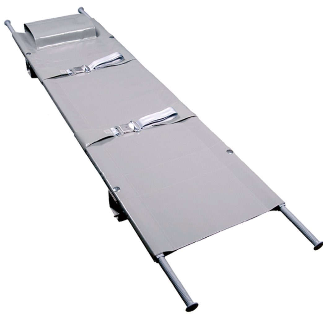 Zweifach klappbare Aluminium-Krankentrage nach DIN 13024 K – ideal für schnellen Einsatz, platzsparende Lagerung und einfachen Transport in jedem Fahrzeug.