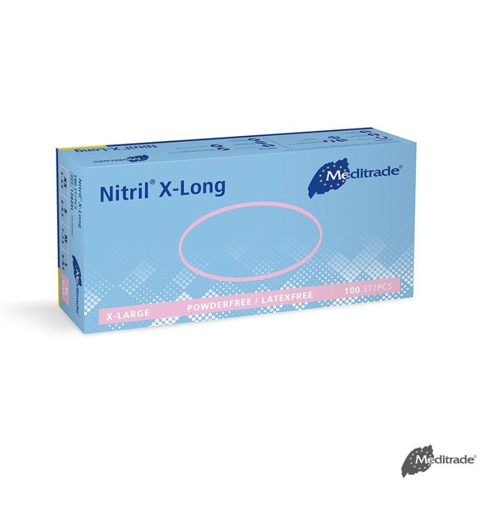 Extralanger Nitrilhandschuh (ca. 29 cm) für erweiterten Schutz von Hand und Unterarm – ideal bei Kontakt mit Chemikalien, Zytostatika oder infektiösen Flüssigkeiten.