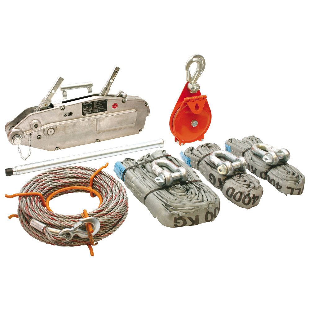 Neu konzipierter Satz nach DIN 14800-5:2013-12. Kasten 1: 1 Stück Dönges FireBox nach DIN 14880-1-LM (600 x 400 x 220 mm), mit Einteilung und Aufklebern 1 Stück Wadra Mehrzweckzug 816 1 Stück Hebelrohr (passt nicht in die Transportbox) 1 Stück Kantenreiter 2 Stück Ersatzscherstifte 1 Stück Aufhängeglied, Form A ohne Flachstelle, Güteklasse 8, Tragfähigkeit 40 kN Kasten 2: 1 Stück Dönges FireBox, nach DIN 14880-1-LM (600 x 400 x 220 mm) 1 Stück Umlenkrolle, einseitig zu oÌ?ffnen, einrollig mit Wirbelhaken und einer Zugkraft von 40kN 2 Stück Rundschlingen nach DIN EN 1492-2 aus Polyester, Tragfähigkeit 40 kN, Nutzlänge 2 m 1 Stück Rundschlinge nach DIN EN 1492-2 aus Polyester, Tragfähigkeit 40 kN, Nutzlänge 4 m 3 Stück Schäkel in geschweifter Form nach DIN 13889, Tragfähigkeit min. 40kN Separat wird geliefert: 1 Stück Seil, Durchm. Ø 11,5 mm, 30 m lang, mit Lasthaken, auf Haspel Optional kann bestellt werden: 1 Stück Erdanker Grösse 1 mit 8 Heringen 1 Stück Brechstange DIN 14853-1500 1 Stück Kantholz