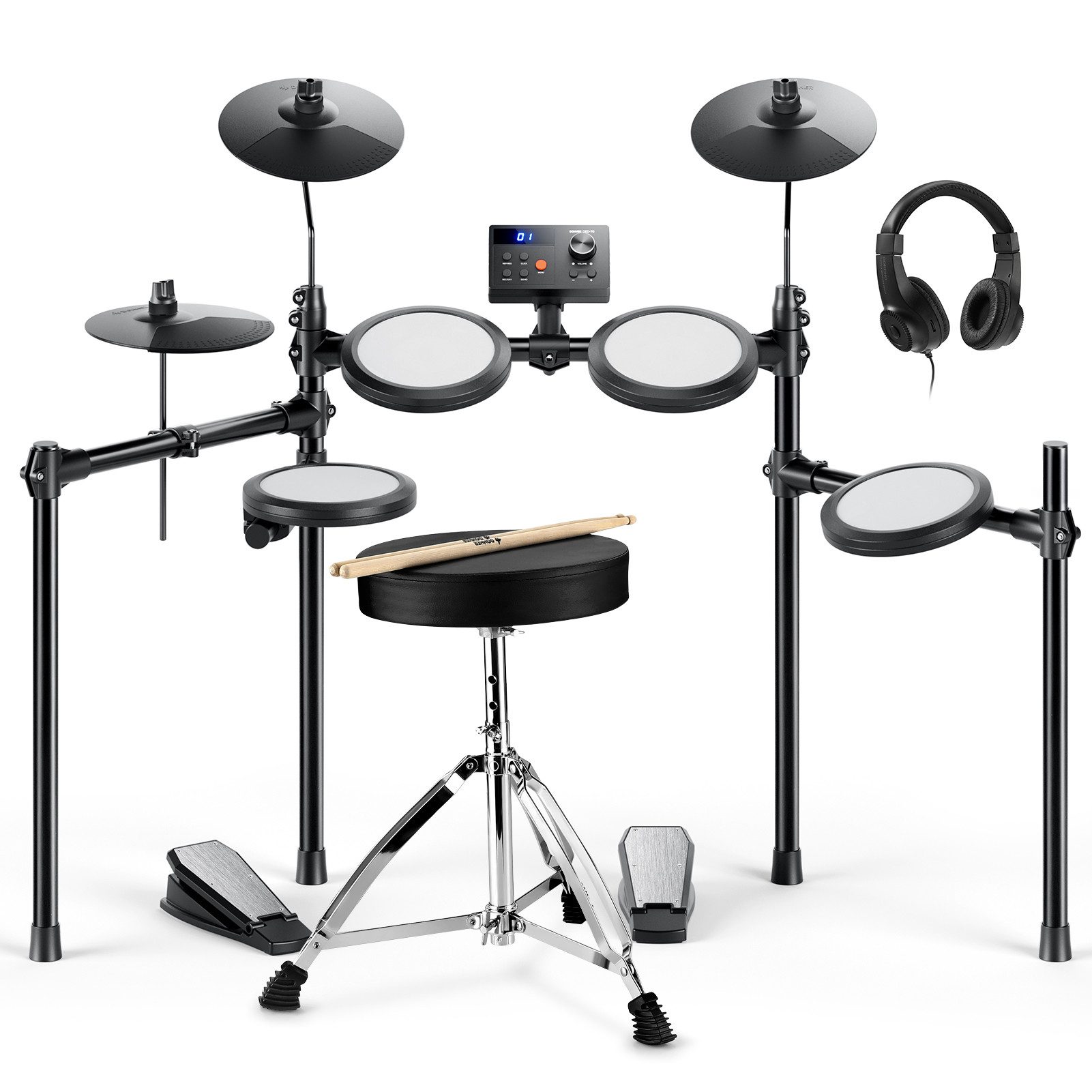 Hauptmerkmal. - All-inclusive-Einsteiger-Kit, sofort spielbereit - Realistisches Spielgefühl, das akustische Trommeln imitiert und gleichzeitig die Geräuschentwicklung gering hält. - 150 integrierte Soundeffekte, 15 anpassbare Drum-Kits und 10 Demo-Songs helfen Anfängern, eine breite Palette von Musikstilen zu erkunden. - Verwenden Sie die mitgelieferten Kopfhörer für intensive, leise Proben. - Oder schließen Sie einen externen Lautsprecher/Verstärker an, um mit Freunden zu improvisieren oder für Ihre Familie aufzutreten. - Kompatibel mit Smartphones, Tablets und Musik-Apps, die Backing Tracks oder Aufnahmen unterstützen. - Verstellbare Trommel- und Beckenhöhe für die Begleitung von Kindern und Jugendlichen - Der Ständer ist leicht und zusammenklappbar für eine einfache Aufbewahrung. - Zwei Stromversorgungsmodi, um überall spielen zu können - perfekt für das Üben im Freien. - Kostenloser Schlagzeugunterricht, um das Erlernen von Musik zu unterstützen.