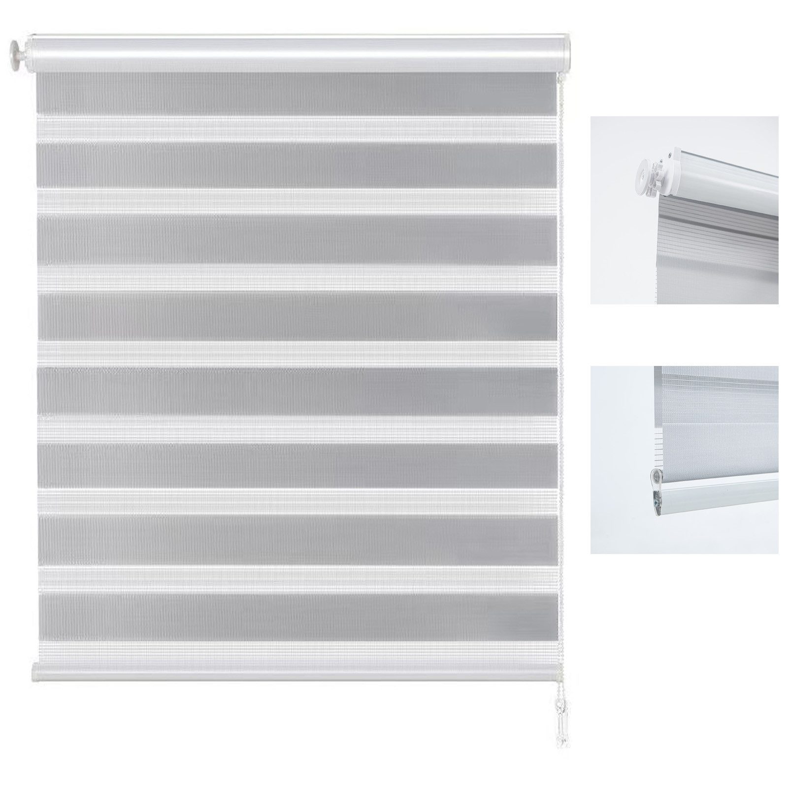 Das Doppelrollo mit Klemmfix ohne Bohren besteht aus abwechselnd halbtransparenten und abdunkelnden Stoffstreifen.