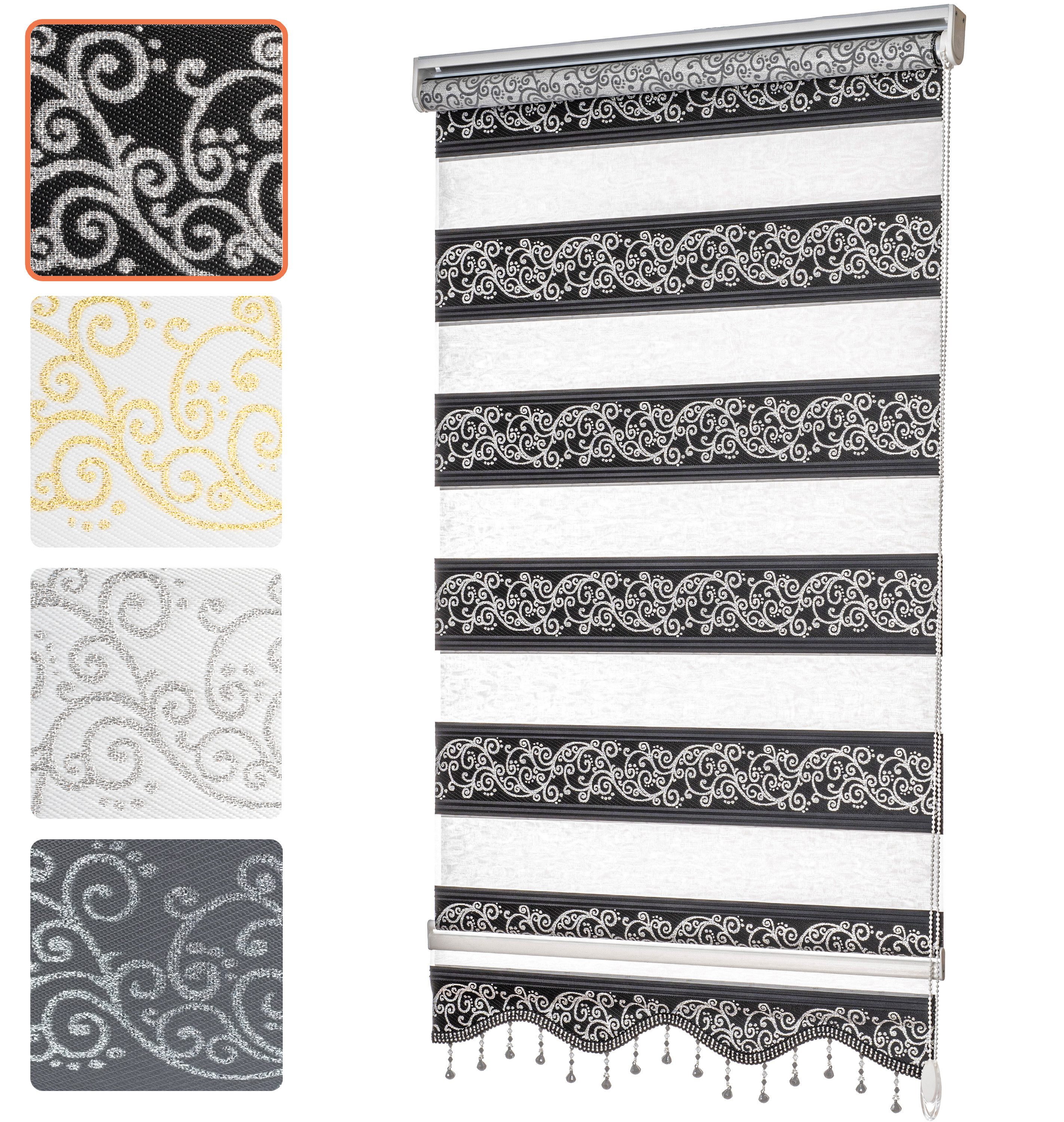Dieses gemusterte Doppelrollo mit Perlen, das mit Blumen und Ranken versehen ist, bringt einen bezaubernden und ausgefallenen Look in Ihr Zuhause.