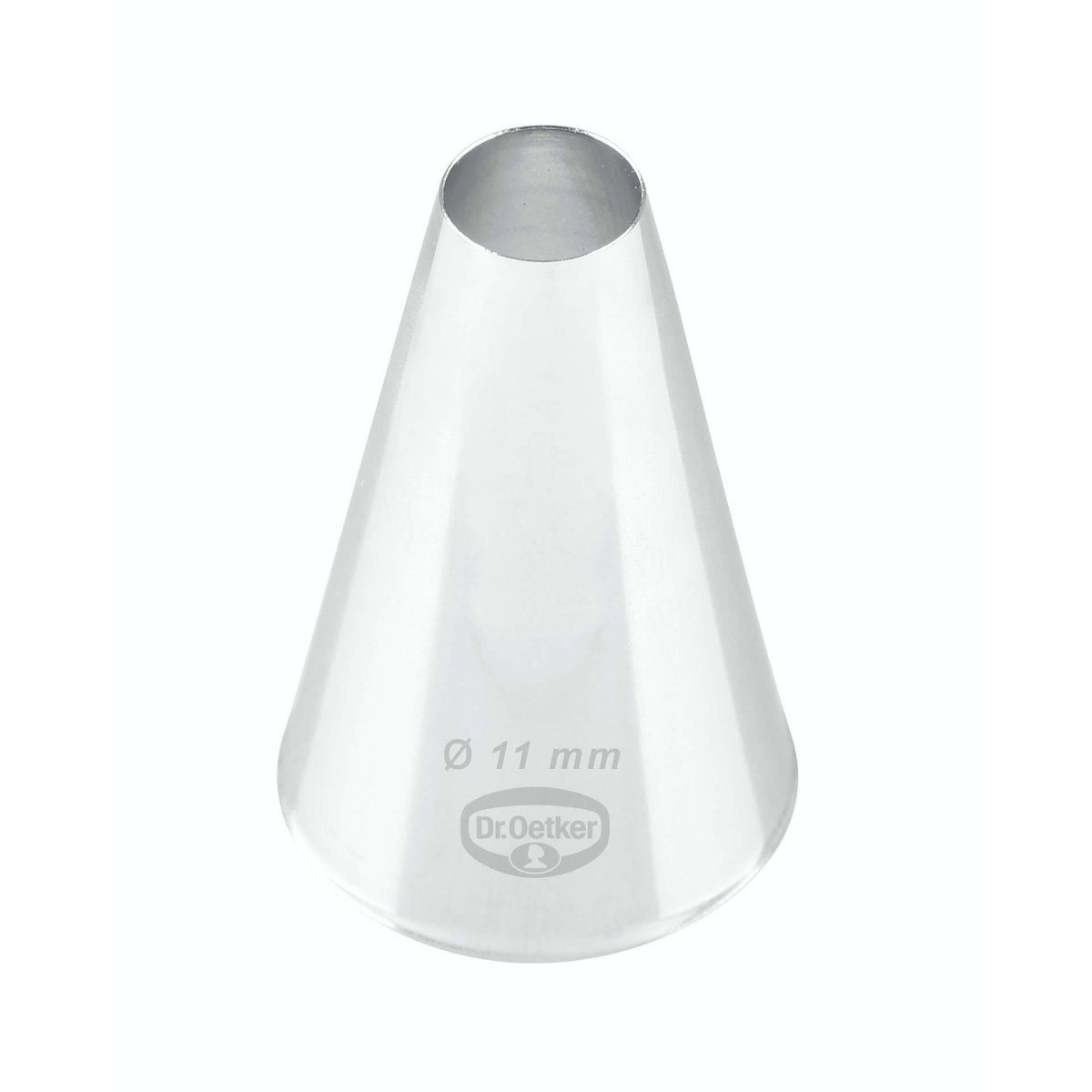 Die Lochtülle von Dr. Oetker (Ø 11 mm) besteht aus hochwertigem Edelstahl und verziert süße Leckereien mit tupfen-, perlen- oder seilförmigen Borten. Sie ist aus einem Stück gezogen, ohne störende Naht und ist dabei spülmaschinengeeignet. Die Lochtülle passt sowohl mit, als auch ohne Universaladapter.