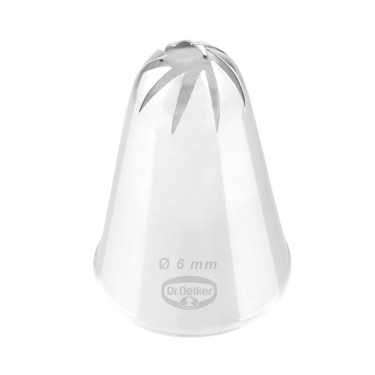 Die Rosettentülle von Dr. Oetker (Ø 6 mm) besteht aus hochwertigem Edelstahl und verziert süße Leckereien mit einem rosenartigen Topping. Sie ist aus einem Stück gezogen, ohne störende Naht und ist dabei spülmaschinengeeignet. Die Rosettentülle passt sowohl mit, als auch ohne Universaladapter.