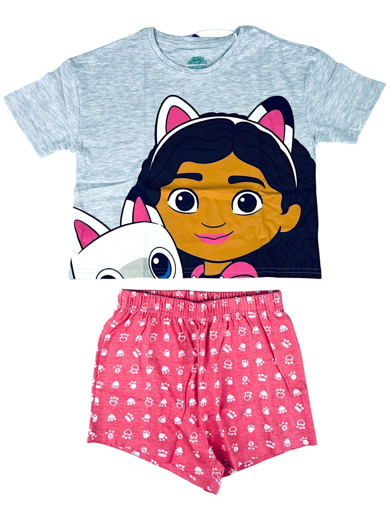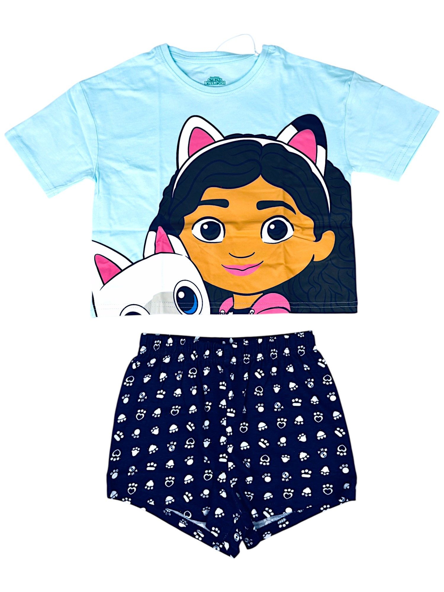 Das kurz geschnitene T-Shirt zeigt die fröhliche Gabby mit Katzenfreund auf hellem Grund, dazu gibt es farblich passende Shorts mit süßem Pfotenmuster.
