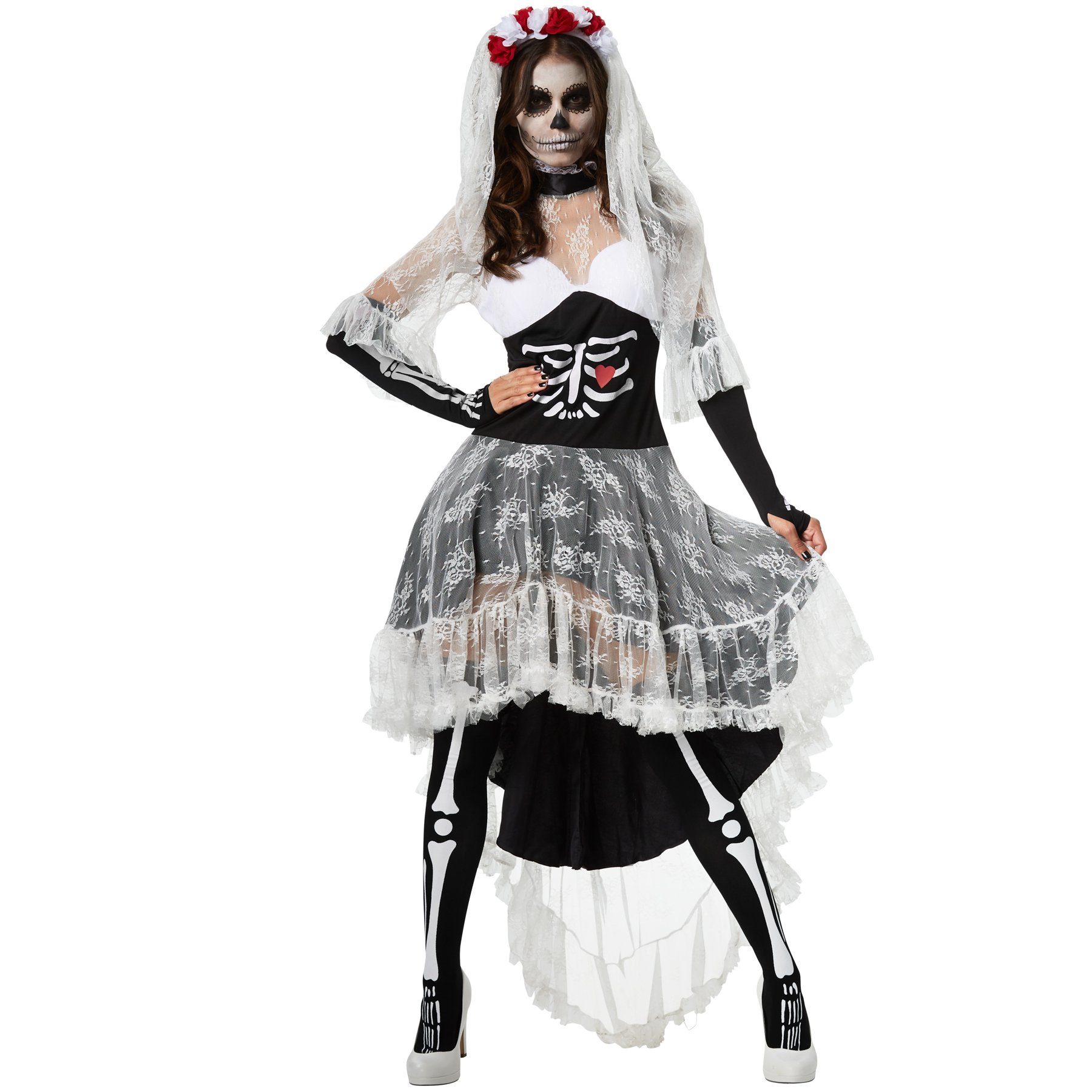 Mit diesem Kostüm kannst Du Deiner Fantasie freien Lauf lassen und in verschiedene Rollen schlüpfen: Vielleicht als mysteriöse Braut aus der Unterwelt oder als elegante Begleiterin eines gruseligen Festes. Die Vielseitigkeit des Designs lädt zu kreativen Interpretationen ein und macht jede Veranstaltung zu einem besonderen Erlebnis.
