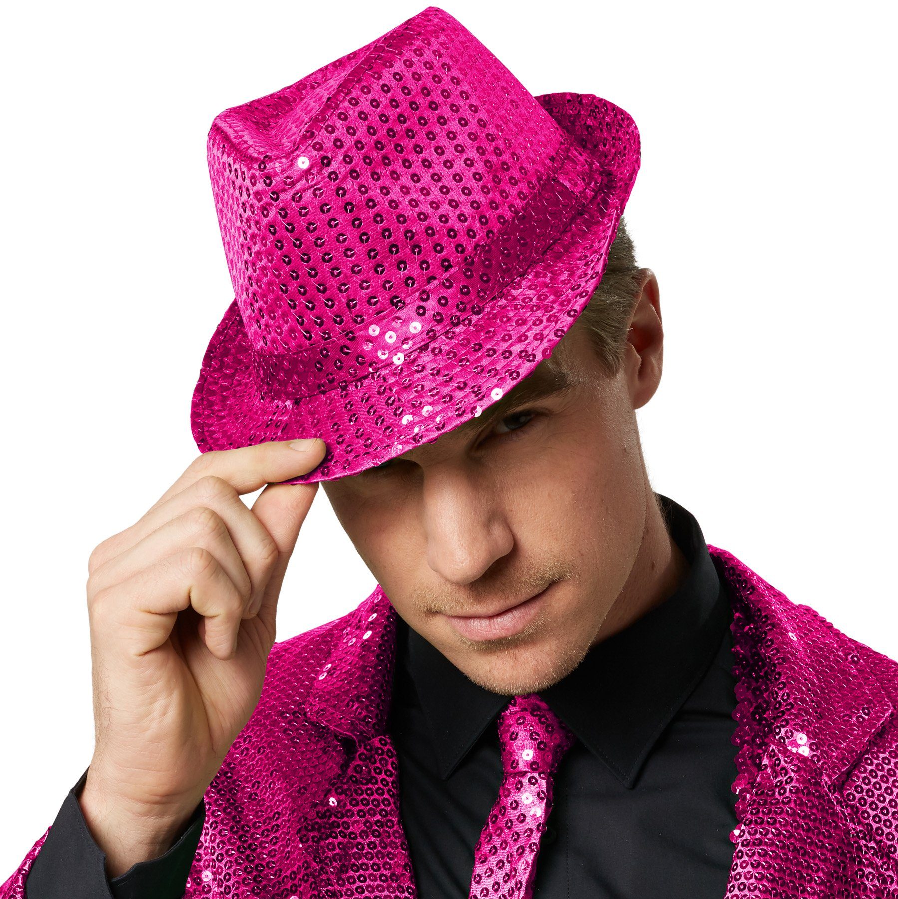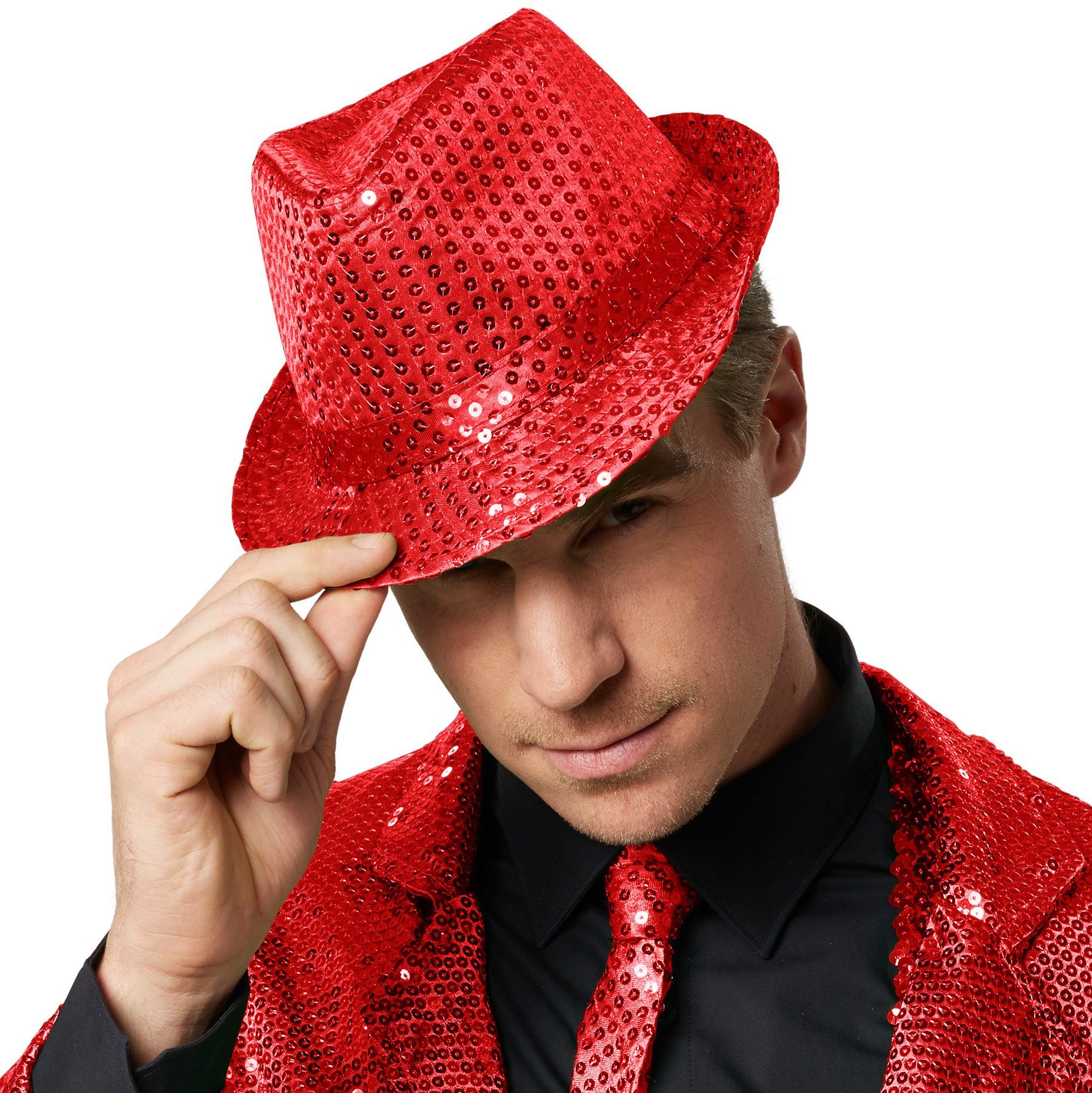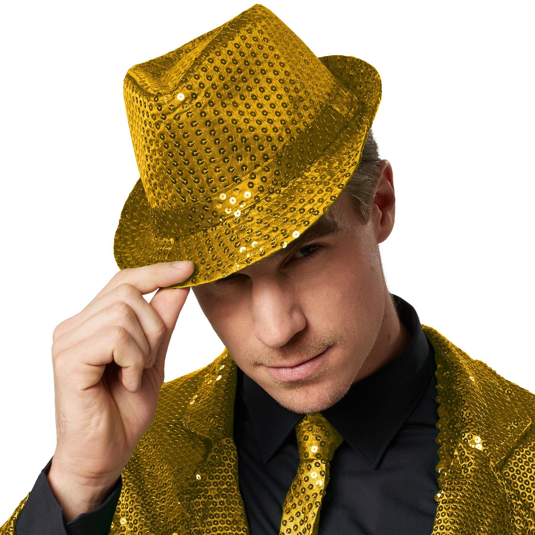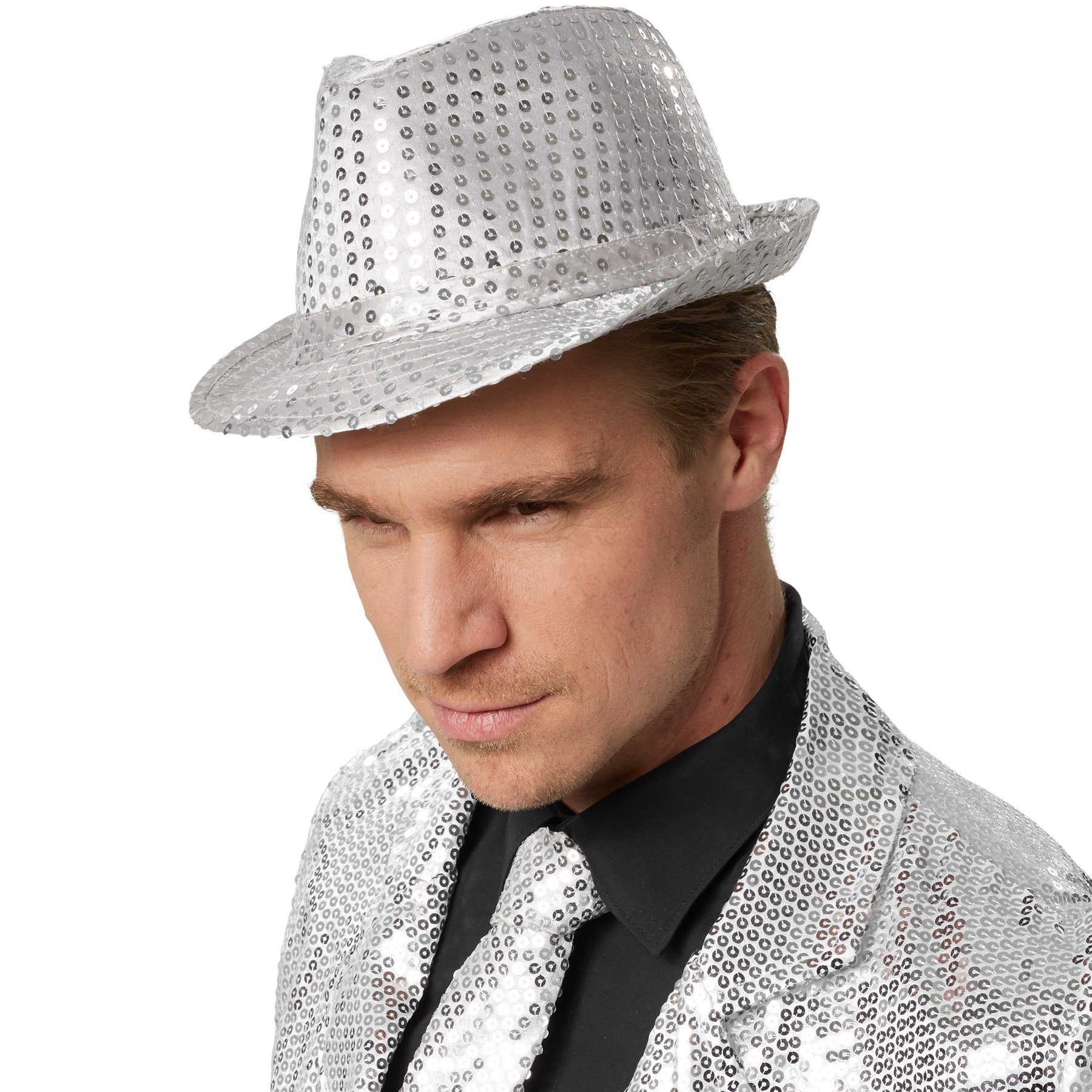 Ein besonderes Highlight sind die glänzenden, angenähten Pailletten, die das Licht bei jeder Bewegung reflektieren und für einen einzigartigen Glitzereffekt sorgen. Ob unter Partylichtern, auf der Tanzfläche oder als auffälliges Detail für ein Show-Kostüm – dieser Hut zieht alle Blicke auf sich.