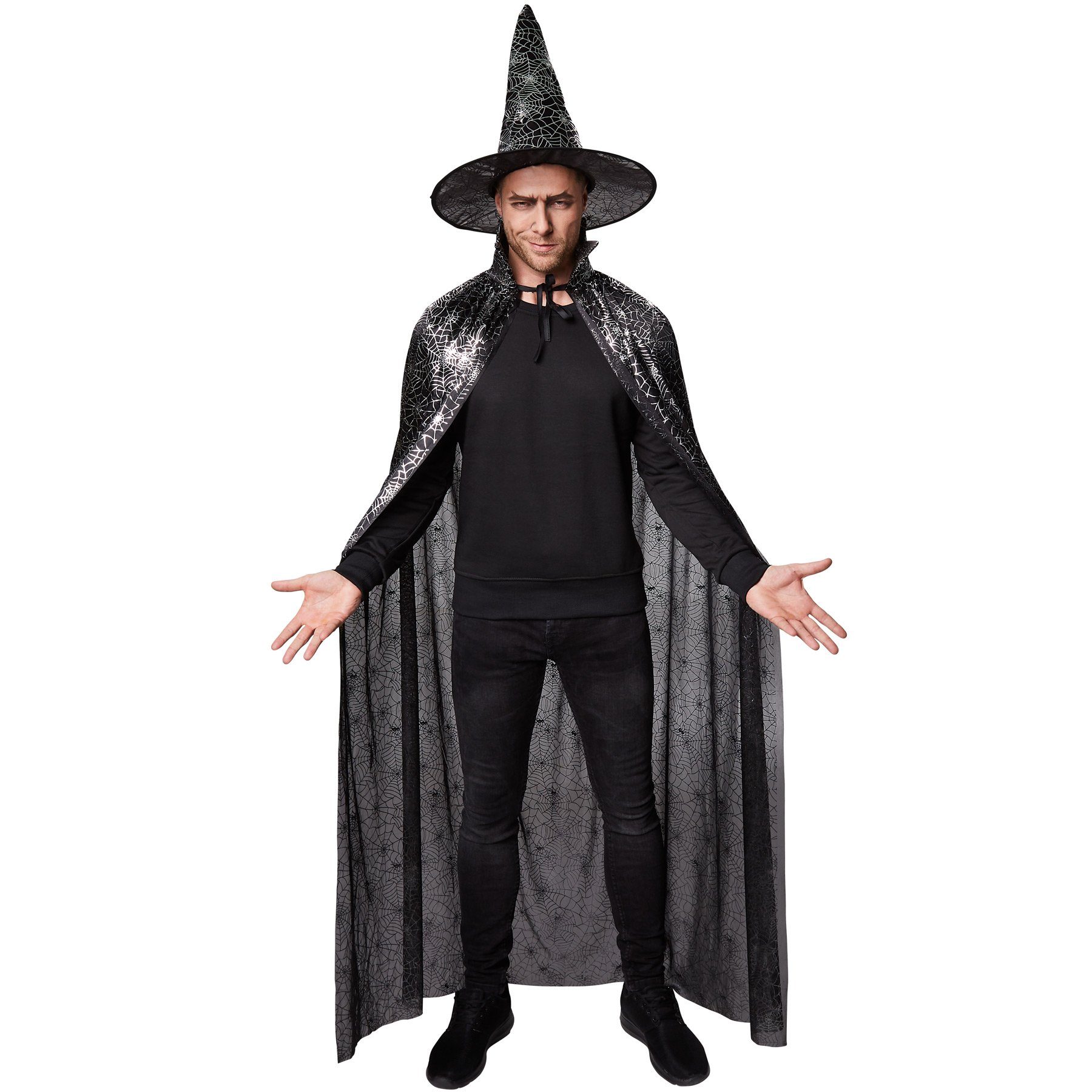 Das Set besteht aus einem stilvollen Hut und einem edlen Umhang, die mit einem zauberhaften Spinnennetz-Muster in Silber verziert sind. Die detailreiche Gestaltung sorgt für einen eindrucksvollen Effekt und lässt das Outfit besonders elegant wirken. Egal, ob Du als Hexe, Magier oder mysteriöse Gestalt auftreten möchtest – mit diesem Accessoire-Set bringst Du eine magische Atmosphäre in jede Veranstaltung!