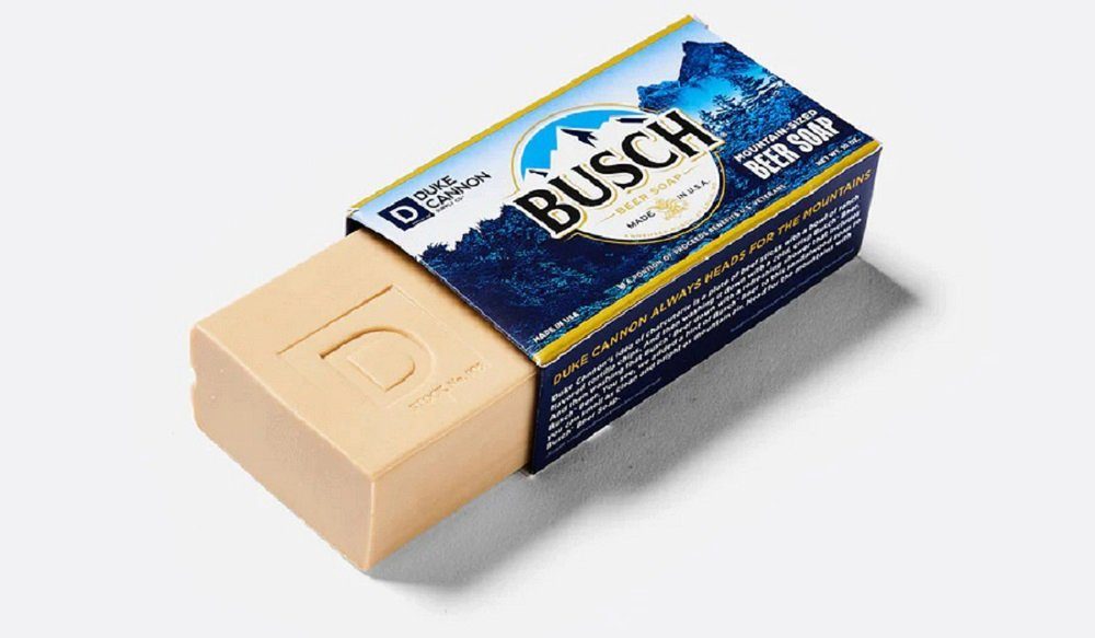 Unsere Vorstellung einer Delikatesse ist ein Teller mit Frikadellen und einer Schale gut gewürzten Tortillachips. Und dann mit einem eiskalten Busch-Bier herunterspülen. Und dann spülst du das Busch-Bier mit einer erfrischenden Dusche herunter, die Busch-Bier enthält. Wir haben also dieser Sandelholzseife einen Hauch Buschbier hinzugefügt, damit du so klar und hell wie Bergluft riechst. Auf in die Berge der Busch Bierseife!