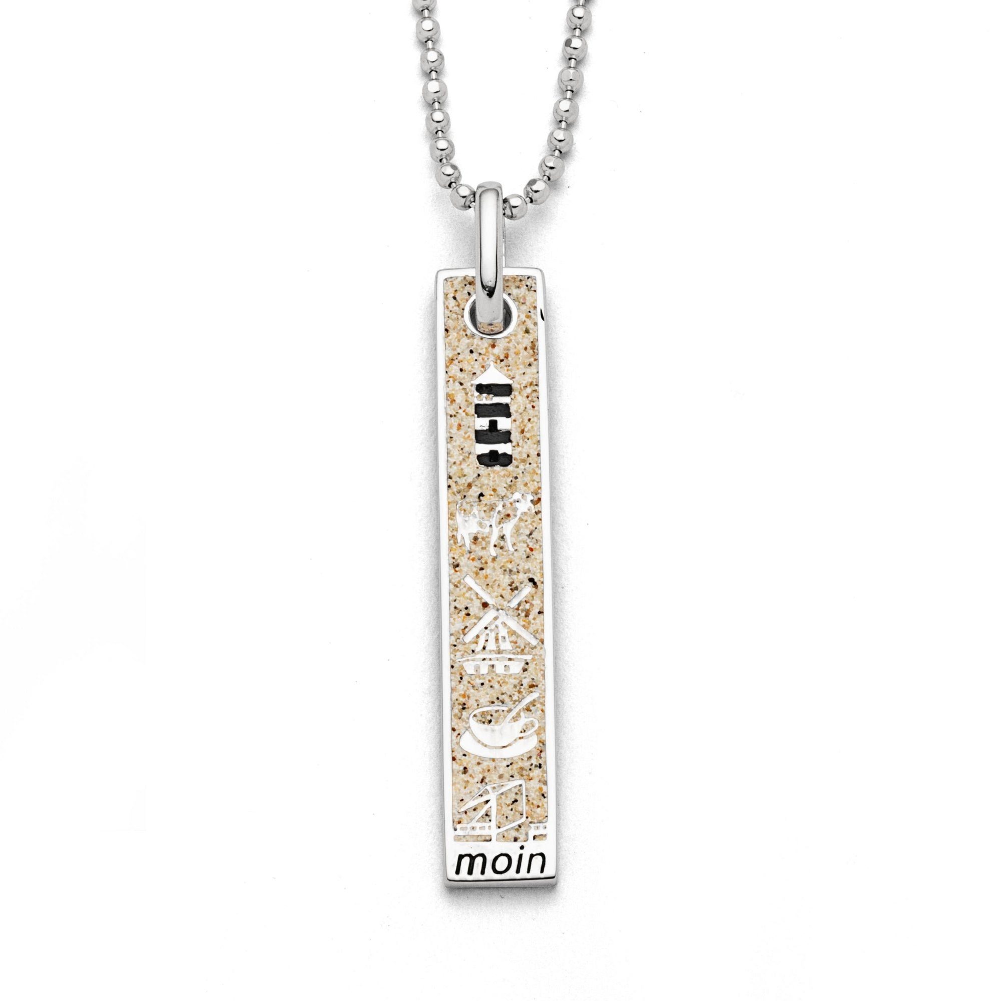Länglicher Anhänger "Ostfriesland" von DUR Schmuck: mit den Motiven: Kuh (Wittmund) - Windmühle (Aurich) - Teetasse (Leer) - Leuchtturm (Pilsum) - Fehnbrücke (Wiesmoor), eingebettet in Strandsand und gefaßt in rhodiniertem 925er Sterlingsilber.