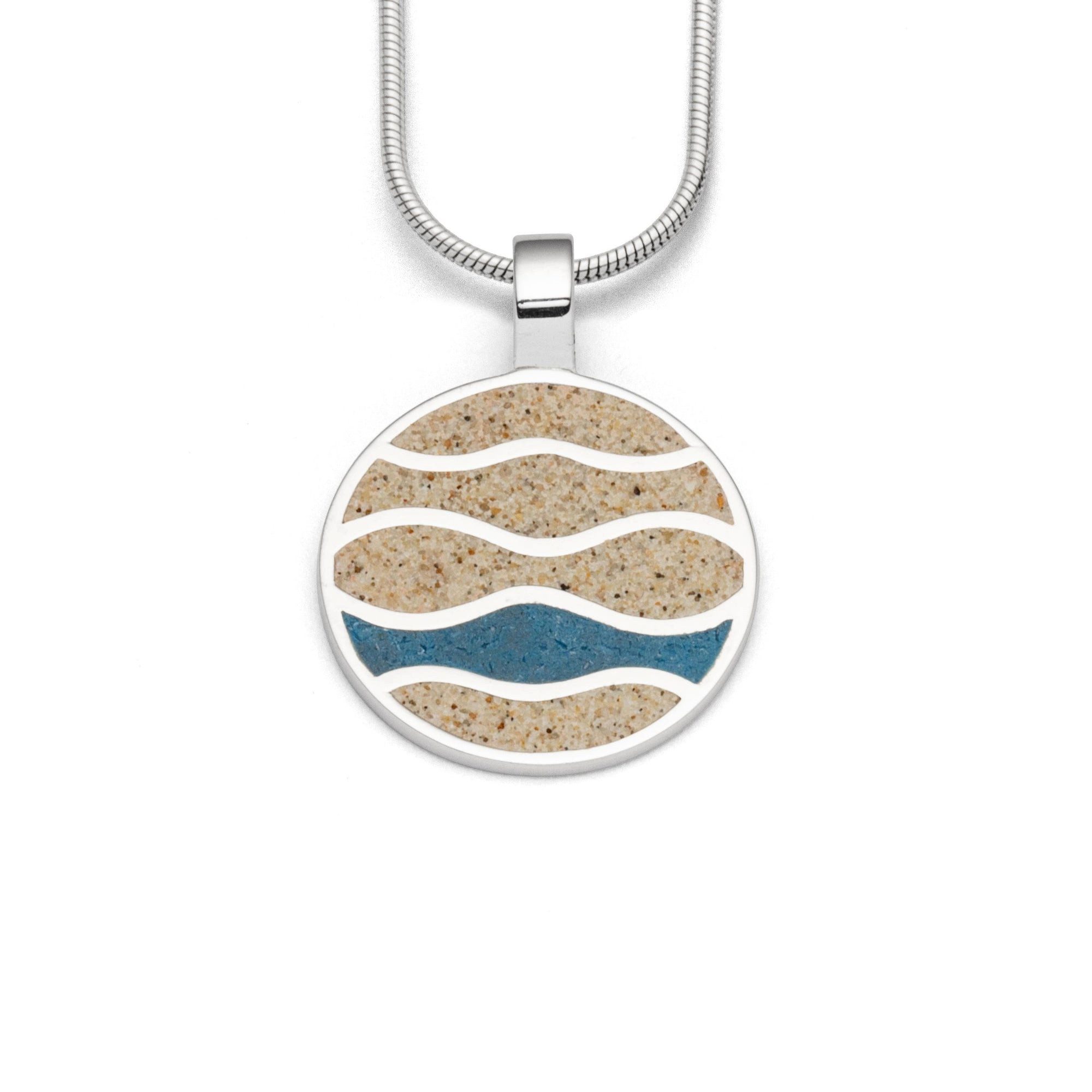 Anhänger „Strandwellen“ von DUR Schmuck, runder Anhänger mit Wellen, gefüllt mit Strandsand und blauem Steinsand, aus rhodiniertem 925er Sterlingsilber.