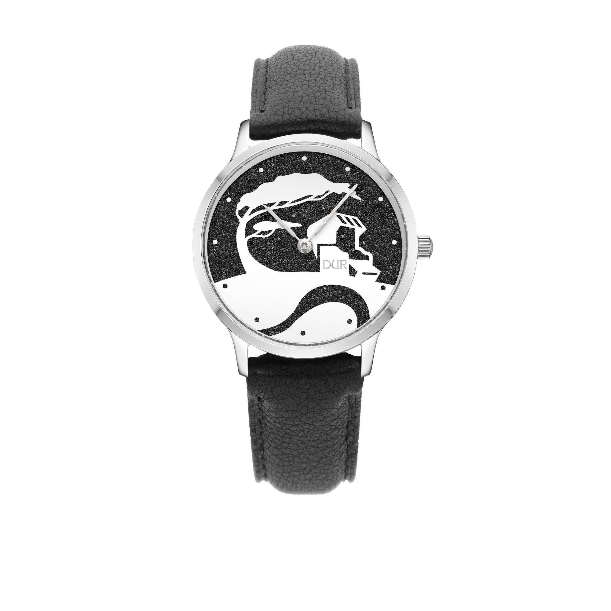 DUR Schmuck Uhr "Küste", wasserdichte Edelstahl DUR Watch mit Saphirglas und polierten Zeigern in Schwertform. Auf dem Ziffernblatt ein horizontal mattierter Windflüchter und Strandkorb mit Lavasand gefüllt. An einem 18 mm breiten, schwarz, gesteppten Rindslederband. Durch die mattierte Ausführung lässt sich die Uhrzeit deutlich besser ablesen.