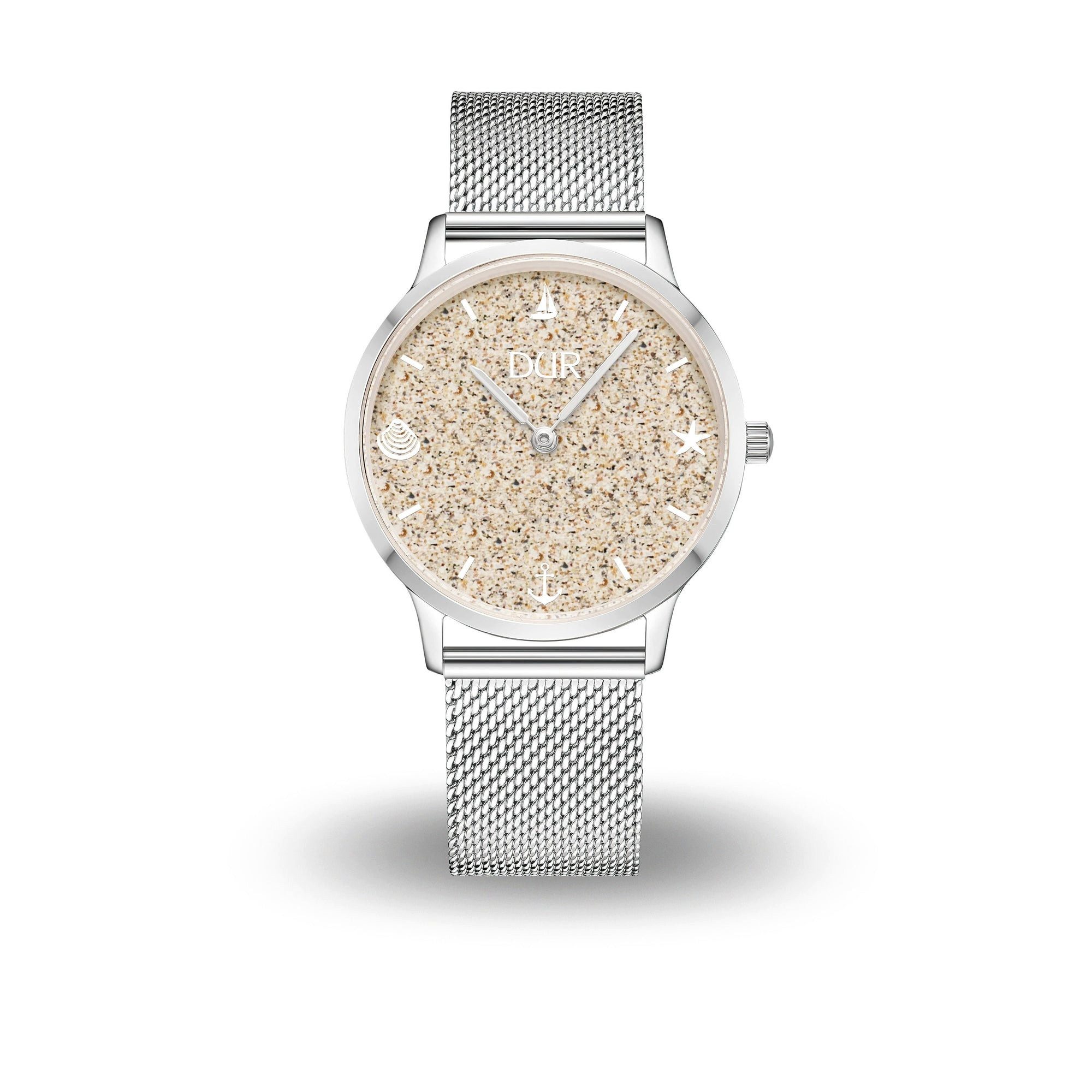 DUR Uhr "Maritim", wasserdichte Edelstahl DUR Uhr mit Saphirglas, polierten Zeigern in Schwertform und einem horizontal mattierten Ziffernblatt mit den Motiven: Segelboot -Seestern - Anker - Muschel, die mit Strandsand gefüllt sind. An einem 18 mm breitem Edelstahl Meshband.