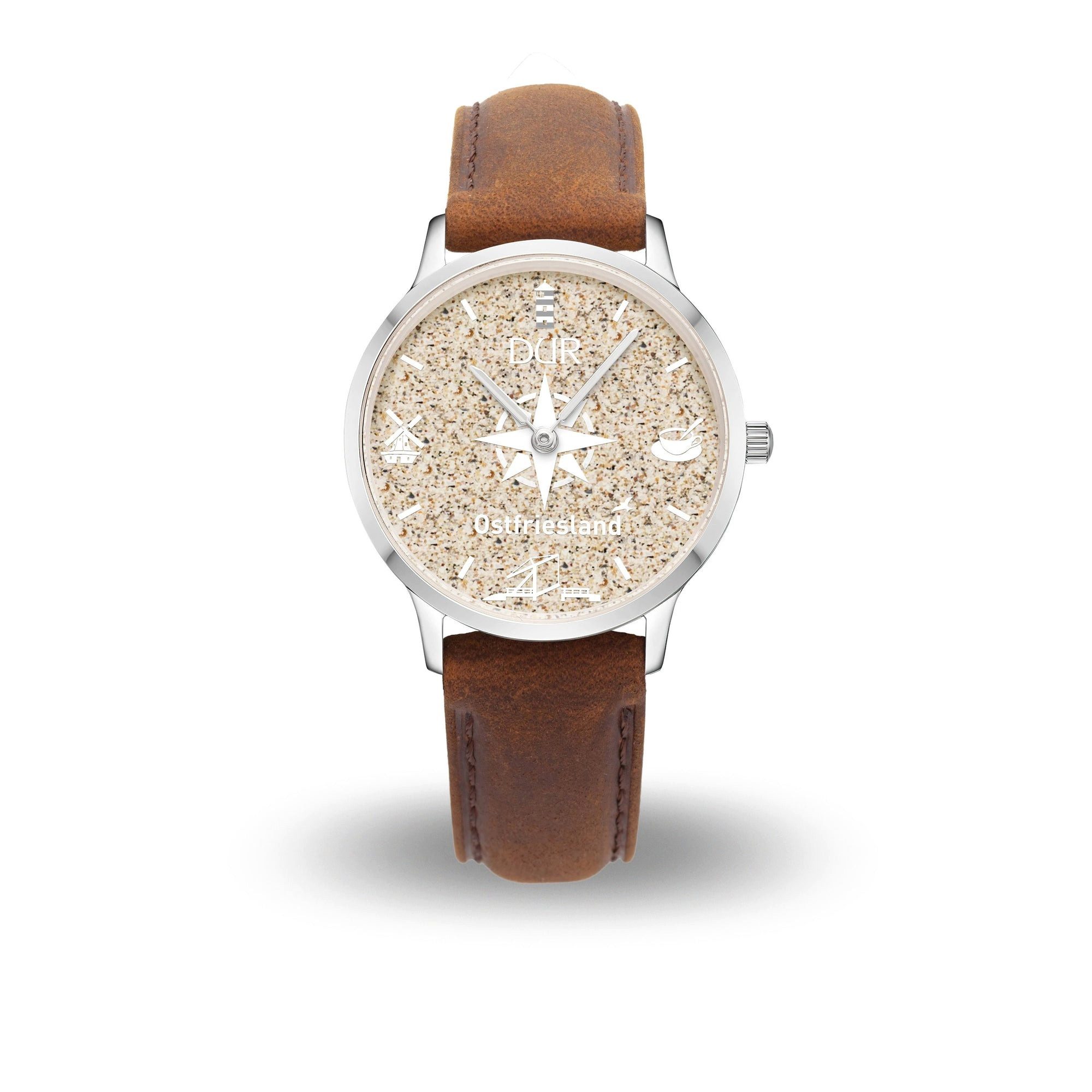 DUR Uhr "Ostfriesland", wasserdichte Edelstahl DUR Uhr mit Saphirglas. Auf dem Ziffernblatt die Motive:-Pilsumer Leuchtturm-Teetasse-Fehnbrücke-Windmühle und in der Mitte eine Kompassrose, die mit Strandsand gefüllt sind. An einem 18 mm breitem braunem Lederband