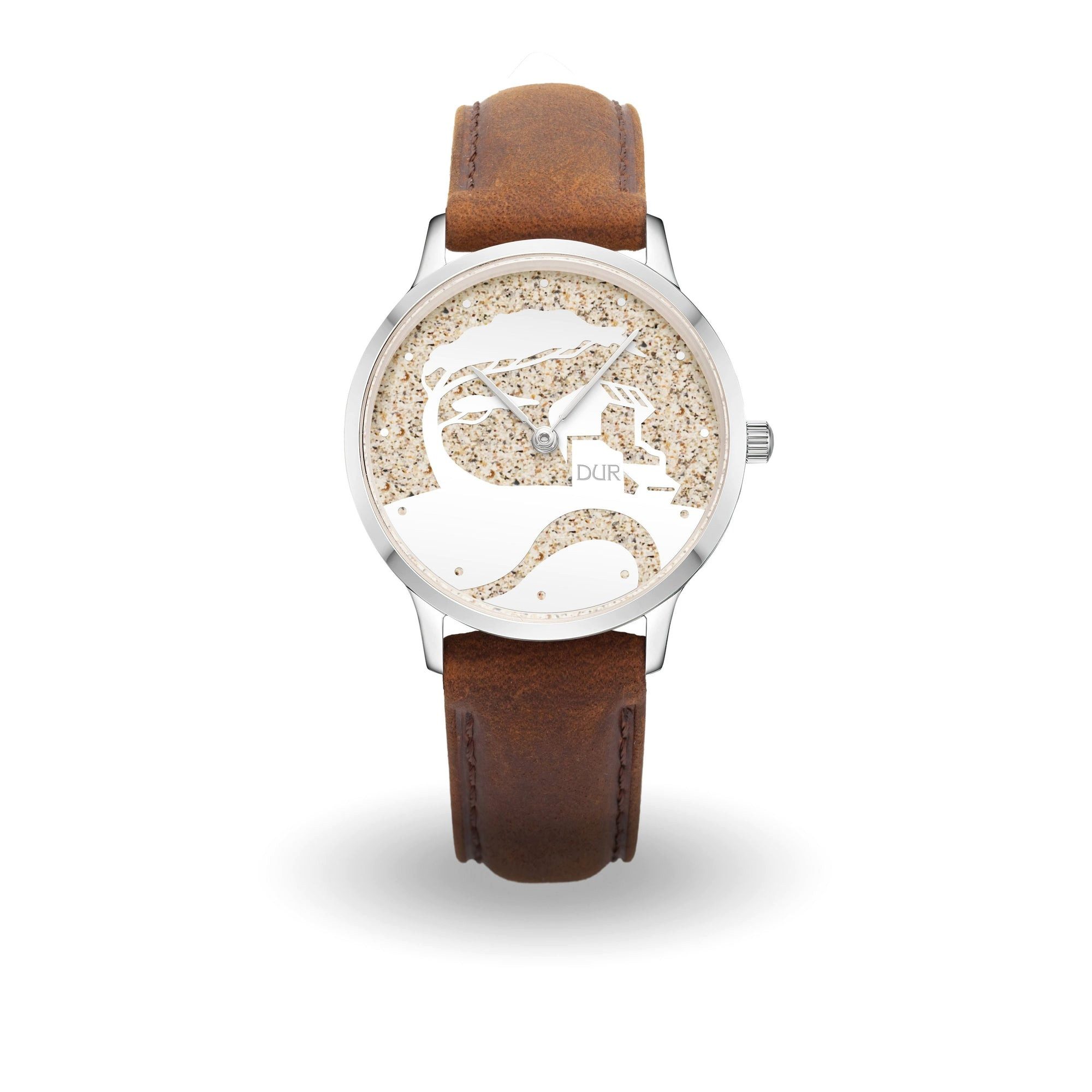 DUR Schmuck Uhr "Küste", wasserdichte Edelstahl DUR Watch mit Saphirglas und polierten Zeigern in Schwertform. Auf dem Ziffernblatt ein horizontal mattierter Windflüchter und ein Strandkorb mit Strandsand gefüllt. An einem 20 mm breiten, braun gesteppten Rindslederband. Durch die mattierte Ausführung lässt sich die Uhrzeit deutlich besser ablesen.