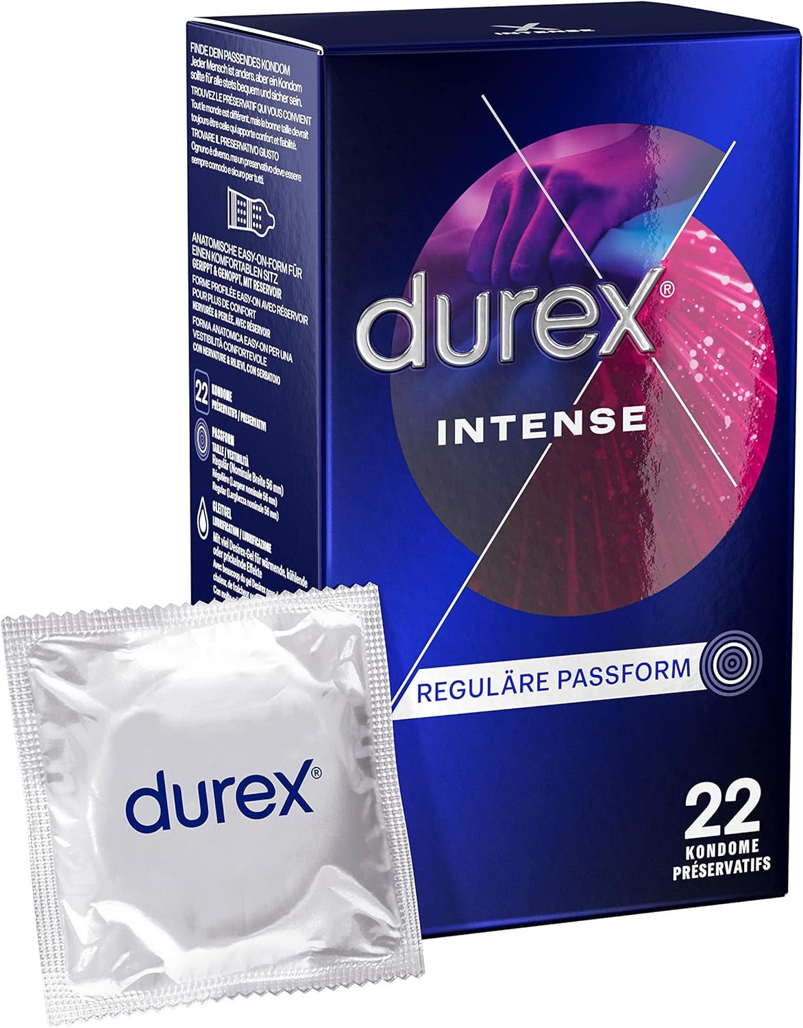 Durex Intense Kondome – Jetzt mit neuem Verpackungsdesign! Durex Intense sind Kondome mit Noppen, Rippen und viel Desirex-Gel für eine besonders intensive vaginale Stimulation beim Sex. Das Stimulationsgel schenkt dabei aufregende Wellen wärmender, kühlender und prickelnder Effekte. Dank der Easy-On-Form sitzt das Kondom bequem, während die neue Formel für einen angenehmen Geruch sorgt. Die richtige Kondomgröße ist wichtig: Ein zu großes Kondom kann abrutschen, ein zu Kleines kann platzen. Durex Intense Kondome haben eine reguläre Размер mit 56 mm nominaler Breite. Durex Kondome durchlaufen 5 Qualitätstests und sind dermatologisch getestet. Zudem wird jedes einzelne Kondom zu 100 % elektronisch geprüft. Denke daran, dass keine Verhütungsmethode zu 100 % vor Schwangerschaft, HIV oder sexuell übertragbaren Krankheiten schützt. Produktinformationen ? Genoppte & gerippte Kondome mit Desirex-Gel ? Material: Naturkautschuklatex ? Nominale Breite: 56 mm (reguläre Passform) ? Transparent und mit viel stimulierendem Gleitgel befeuchtet ? Mit glatter Easy-On-Form und Reservoir ? 22er Pack (1 x 22 Stück) RICHTIG GUTER SEX FÜR ALLE Wir stehen für echten Sex. Egal, auf was ihr steht – wir möchten, dass ihr euch damit gut fühlt. Wir glauben daran, Probleme zu erkennen und kämpfen dafür, sie zu lösen. Sex, der sich gut anfühlt – und gut tut.