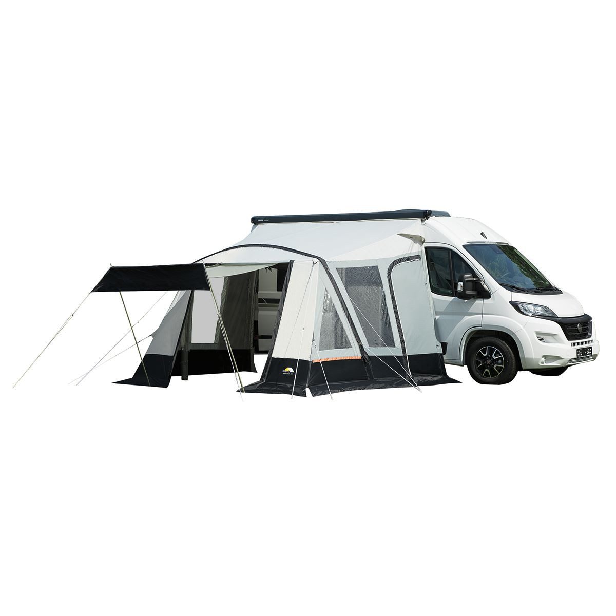 Beide Seitenwände mit großem und kleinen Klarfolienfenster inklusive Gardine und einer seitlich wegrollbaren Tür. Hinter der Tür zusätzlich ein seitlich wegrollbarer Gazeeinsatz der durch Reißverschluss verschließbar ist und vor Insekten schützt. In beiden Seitenwänden eine abgedeckte Hochentlüftung. Bei Regenwetter bietet die Hochentlüftung Schutz und sorgt für eine Dauerbelüftung im Zelt.