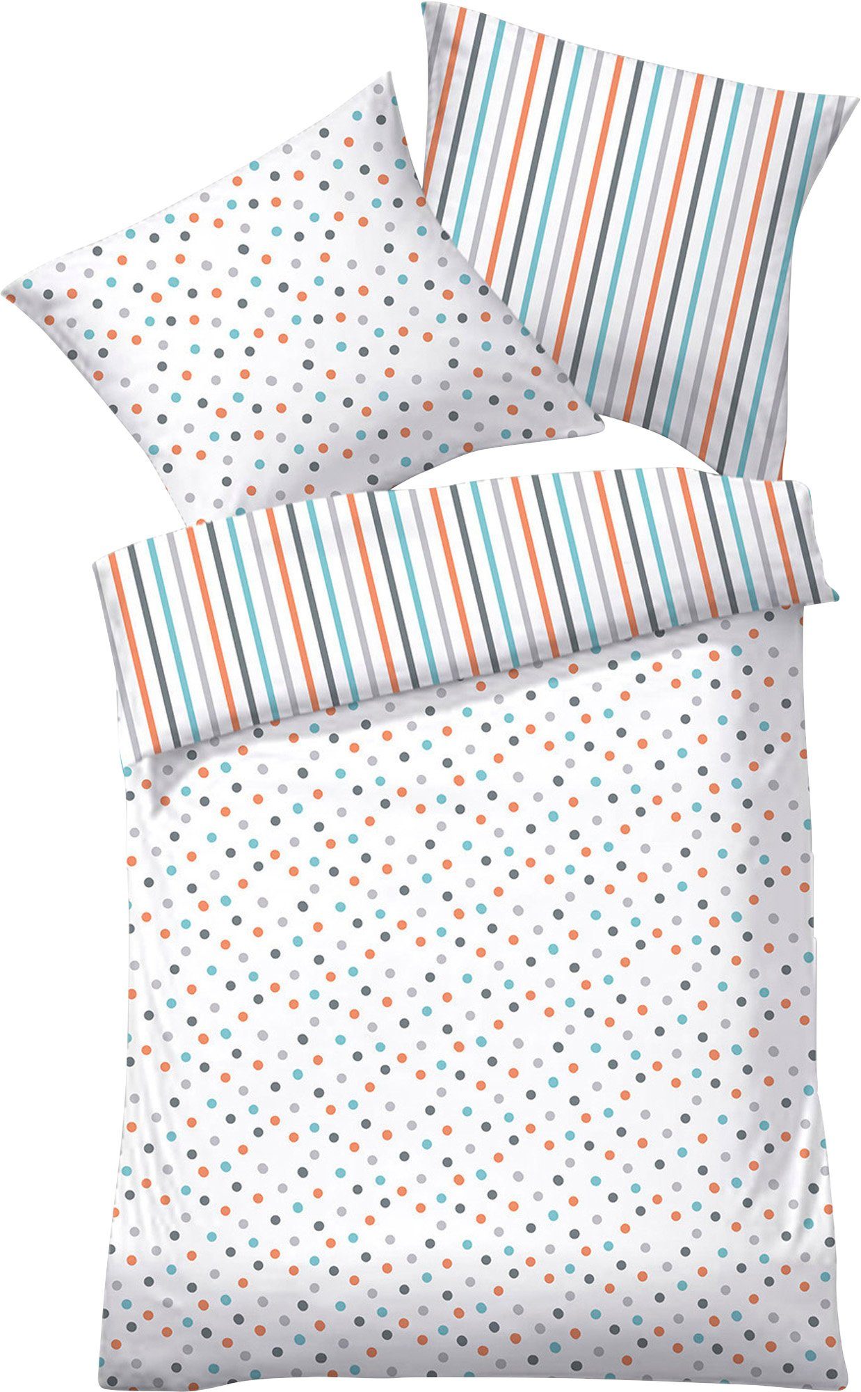 Dyckhoff Weichfrottier Wendebettwäsche. Klassische Streifen oder doch lieber fröhliche Punkte? Nach Lust und Laune können Sie die farbharmonische Bettwäsche drehen und wenden, ganz wie es Ihnen gefällt. Auch qualitativ wird Sie die atmungsaktive Ganzjahresbettwäsche begeistern - sie fühlt sich herrlich weich auf Ihrer Haut an und verwöhnt mit einem wunderbaren Schlafklima. Die strapazierfähige Materialmischung besteht an der dem Körper zugewandten Seite aus reiner Baumwolle. Pflegeleicht, bügelfrei und mit praktischem Reißverschluss für schnelles Beziehen ausgestattet.