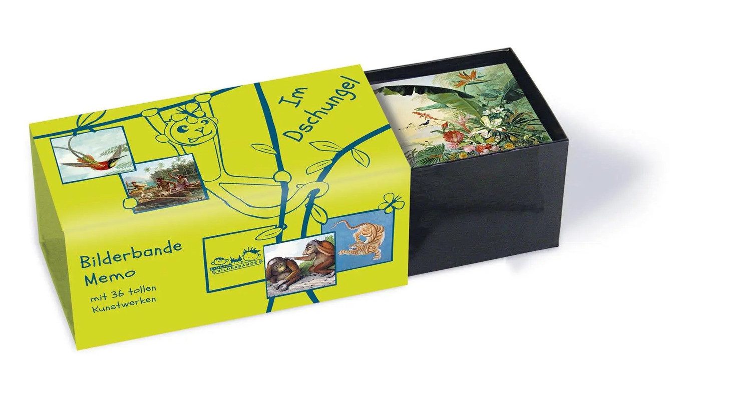 Sei kein Faultier und mach mit hier! Beim BILDERBANDE-Memo geraten alle außer Rand und Band: Schimpanse und Gorilla, Papagei und Elefant - wer hat zuerst alle zusammenge-hörenden Kartenpaare in der Hand? Dieses Spiel ist garantiert so spannend wie das "Dschungelbuch", so aufregend wie eine Folge von "Tarzan". Denn bei dem Streifzug durch den Regenwald trifft man den Panther Bagheera und den Schimpansen Cheeta. Tauche ein in die Tiefen des Urwalds und lerne berühmte Künstler kennen, die affenstarke Bilder geschaffen haben: den Tiermaler August Macke, den Südseemaler Paul Gauguin, den naiven Künstler Henri Rousseau und seine exotischen Pflanzen: Lilien, Lotusblumen, Farne, rot blühende tropische Kaktusse. Und natürlich Palmen, auf denen die braunen Orang-Utans Pongo und Bongo toben oder die hungrige Riesenschlage Boa Boa aufs leckere Abendessen, den Kakadu, wartet. Wenn du ihn retten willst, dann sei auf Zack und finde blitzschnell das Kakadu-Pärchen zwischen den anderen Memo-Kärtchen. Oder hole Hilfe, indem du im verschlungenen Wald nach Louis Dodds Dschungel-Bewohnern suchst. In Kanus, mit Pfeil und Boden rasen sie über den Amazonas und setzten die Schlange schachmatt. - Auf so einer spannenden Expedition wird keiner nass - und es gibt viel Spaß.