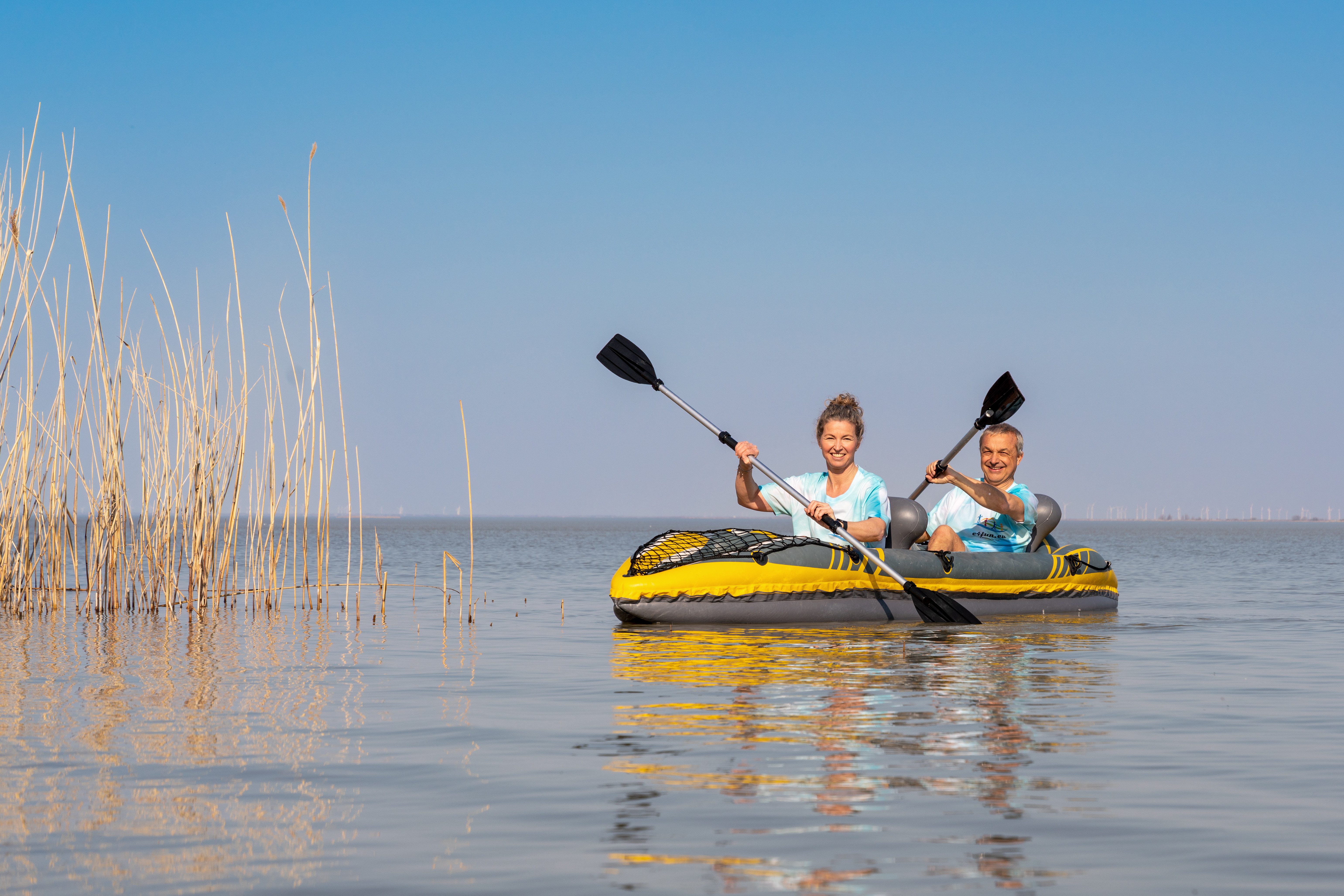 Das aufblasbare Kajak e4fun 350 ermöglicht es, sportlich und entspannt aufs Wasser zu gehen und ist ideal für den Familiengebrauch am Meer, an einem See, einem ruhigen Fluss oder Kanal. Dieses Kajak ist für zwei Personen (bis zu 160 kg insgesamt) geeignet. Das Kajak hat zwei bequeme aufblasbare Sitze und einen aufblasbaren I-Trägerboden für mehr Stabilität. Außerdem hat das Kajak 2 integrierte Finnen (Flossen), um es stabil im Wasser zu halten.