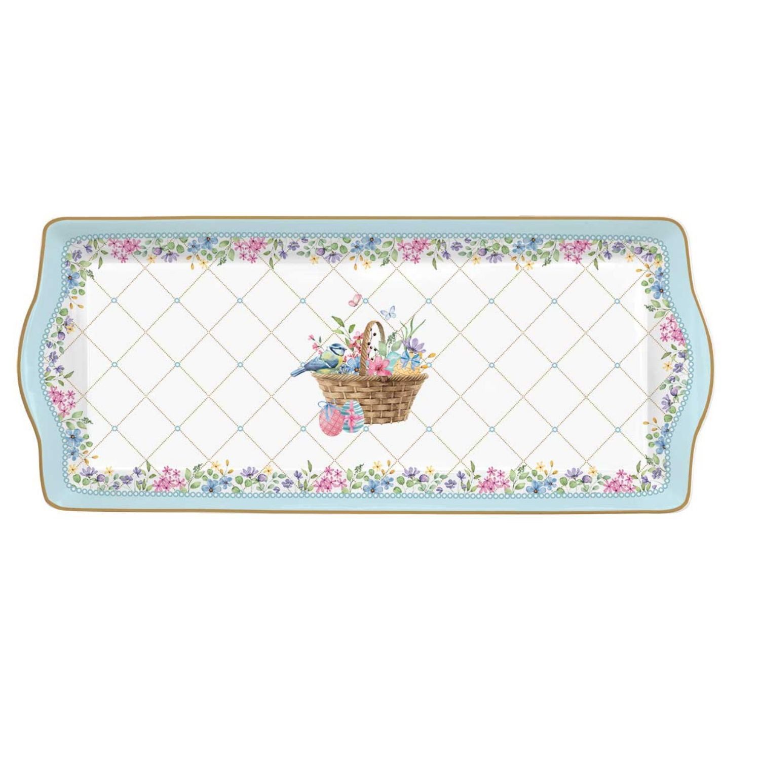 Lieferumfang: 1 Servierplatte SPRING BLOOM mit blauem Rand, kleinen Blümchenranken, Ostereiern und Blumenkorb rechteckig in Geschenkbox