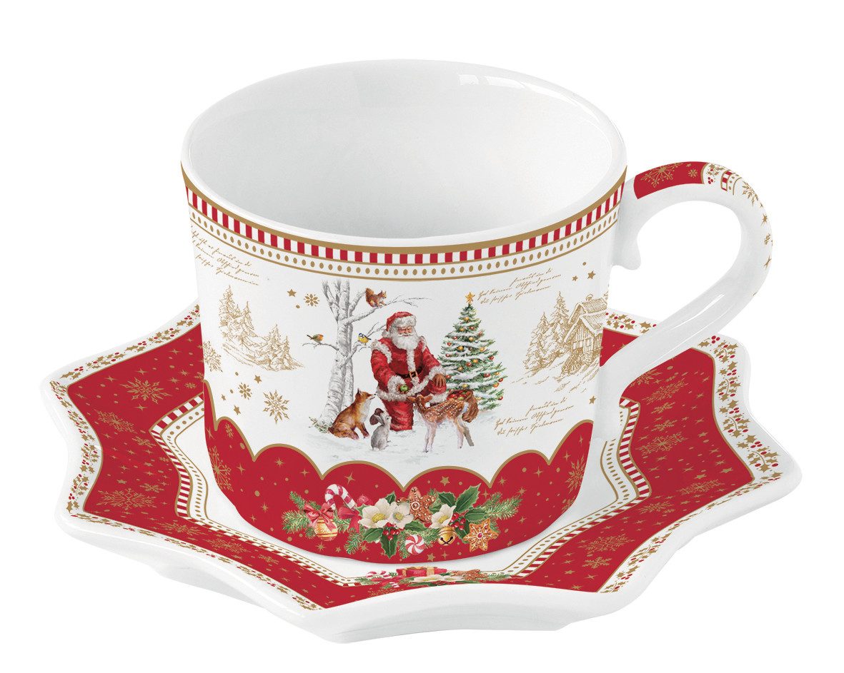 Lieferumfang: Tasse mit Untertasse CHRISTMAS MEMORIES mit nostalgischem Weihnachtsmannmotiv im Winterwald mit Tieren und vielen kleinen Details in Geschenkbox Maße:Tasse Höhe 8cm, Durchmesser 9cm, Длина mit Henkel 11,5cm, Füllmenge ca. 250ml, Teller Durchmesser 15,5cm, Höhe 1,5cm Farbe: weiß mit rot, mehrfarbigem Motiv Material: Porzellan Lieferung erfolgt ohne Dekoration