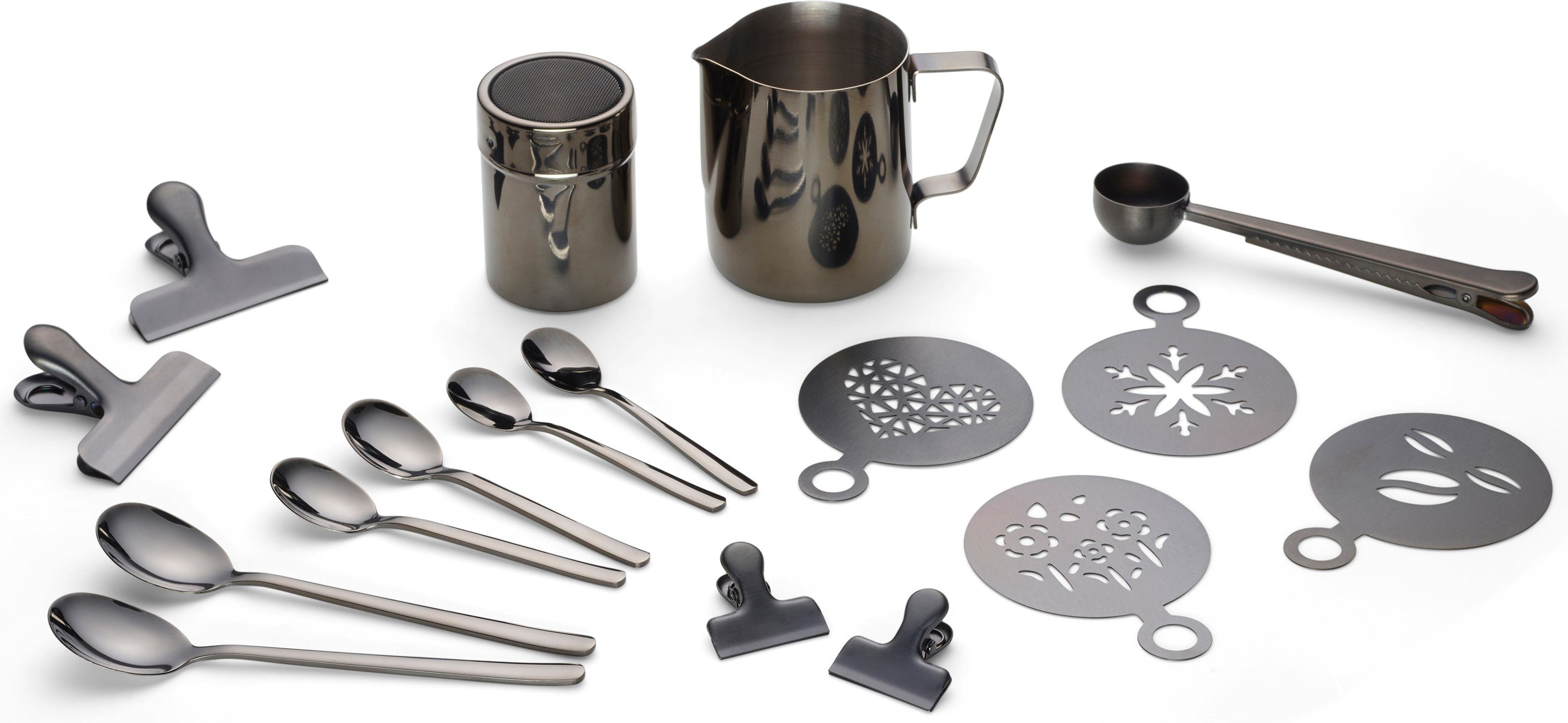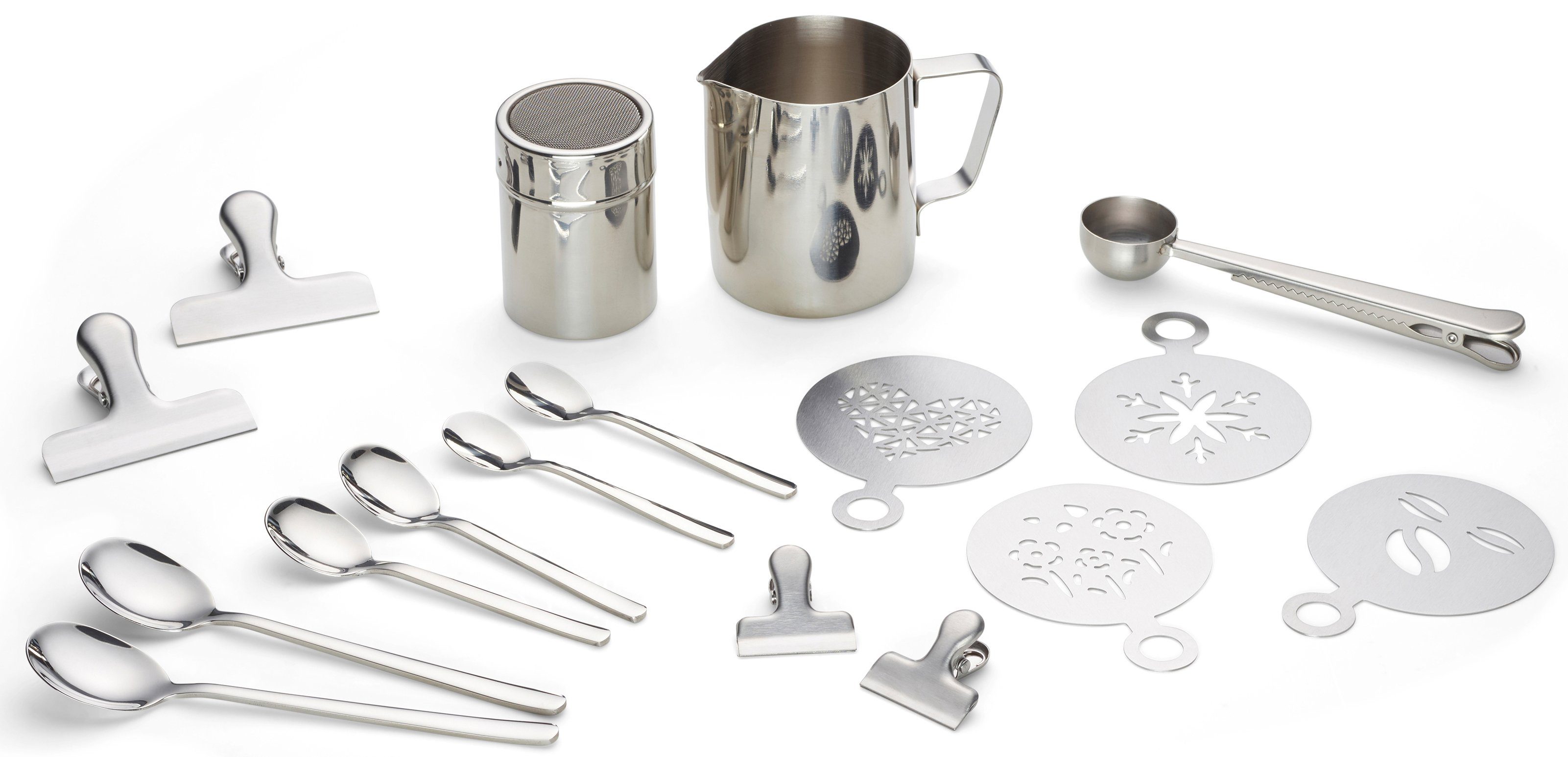 • Milchkanne, Kakaostreuer, 4x Espresso- , 4x Cappuccino-, 4x Latte Macchiato Löffel 1811/13cm, 2x Kaffeeclips 4/ 7,5 cm, 4x Kaffeeschablonen 11,5x8,5cm, Kaffeemesslöffel
