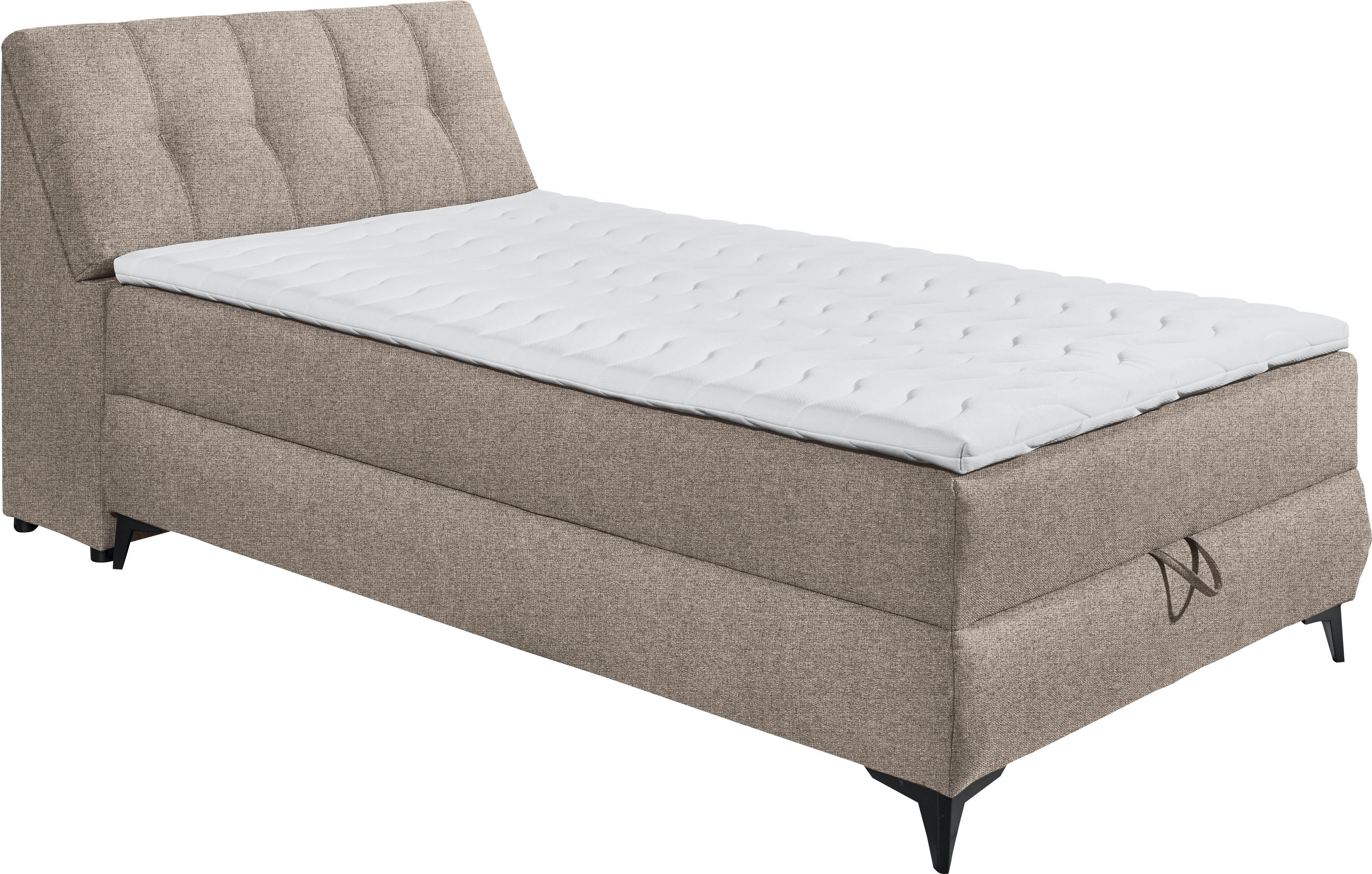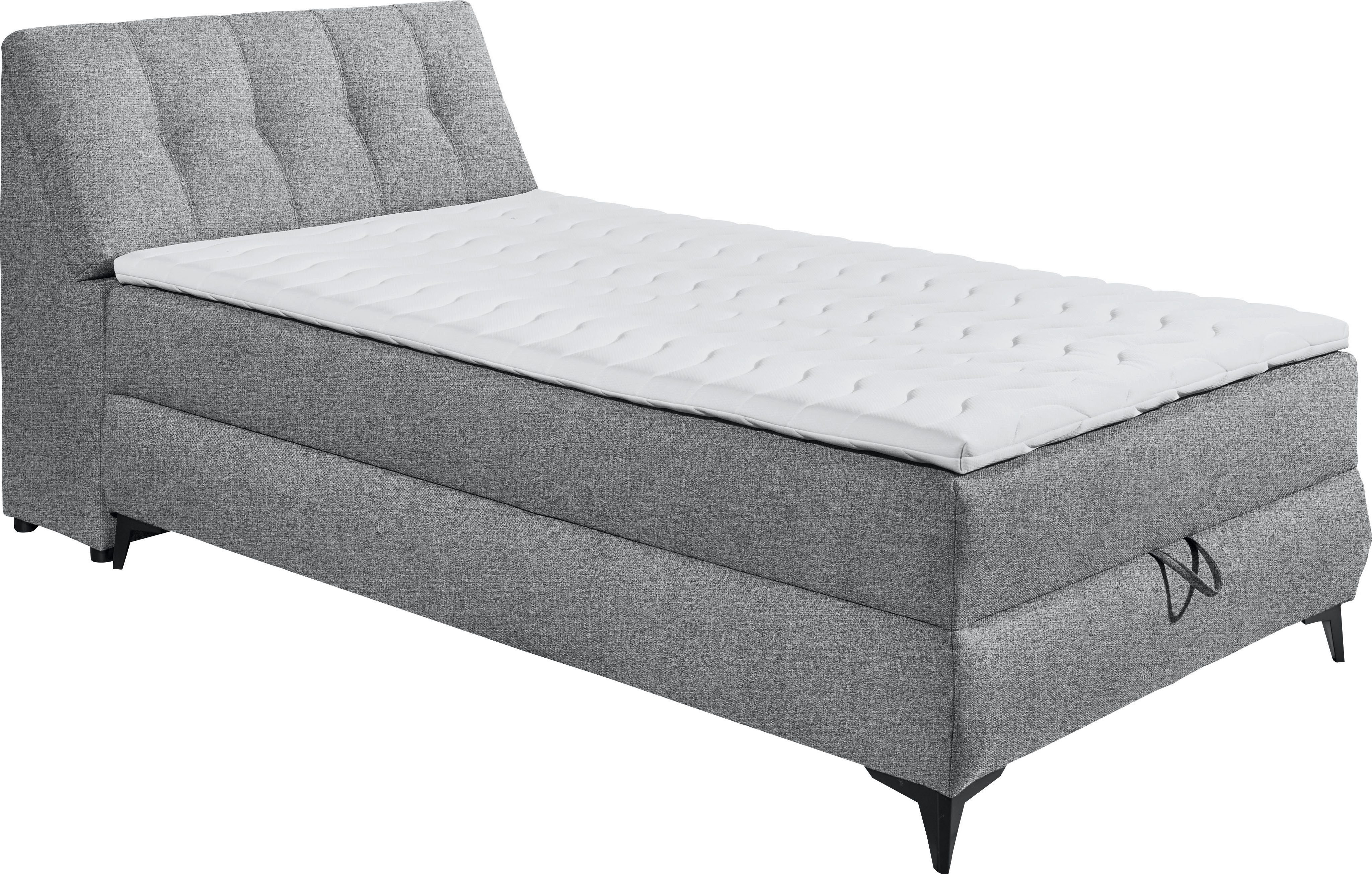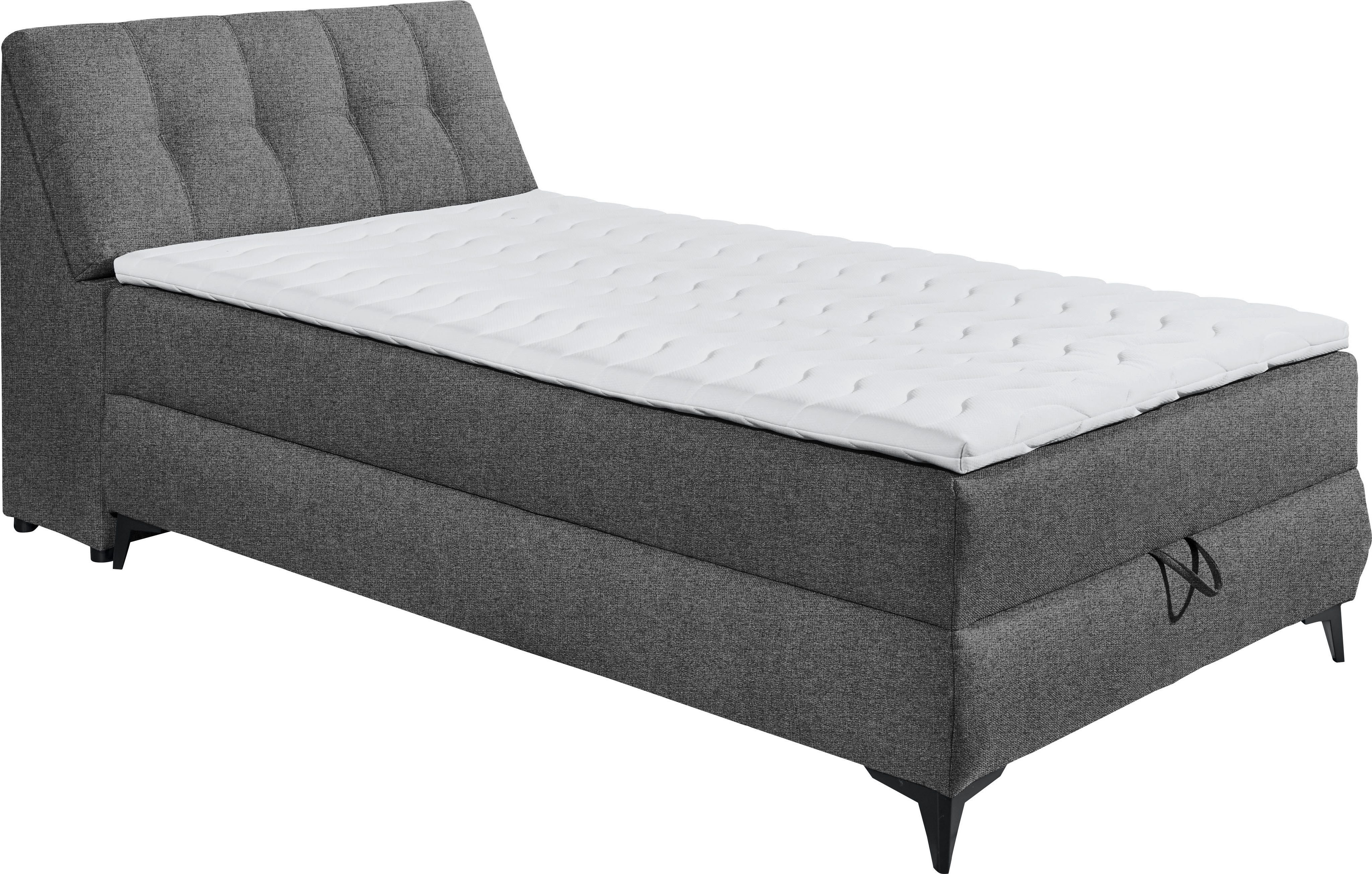 Um ein echtes Platzwunder handelt es sich bei diesem Boxbett »Atlantis« von ED EXCITING DESIGN, das mit einem Bettkasten versehen ist. Die Unterbox aus Bonnell-Federkern stützt deinen Körper gleichmäßig und sorgt für ein angenehm federndes Gefühl beim Liegen. Die maximale Belastbarkeit liegt bei einem Gewicht von 120 Kilogramm. Der Kaltschaum-Topper ist 4 cm hoch und liegt als zusätzliche Lage auf der Matratze auf. Dabei erhöht er den Schlafkomfort und rundet dein Schlafsystem ab. Das Kopfteil ist 102 cm hoch. Über das richtige Equipment für die Montage brauchst du dir keine Gedanken machen, denn das Montagematerial wird dir mitgeliefert. Bei diesem Produkt ist nur eine Teilmontage erforderlich, wodurch es mit wenig Aufwand schnell aufgebaut ist.
