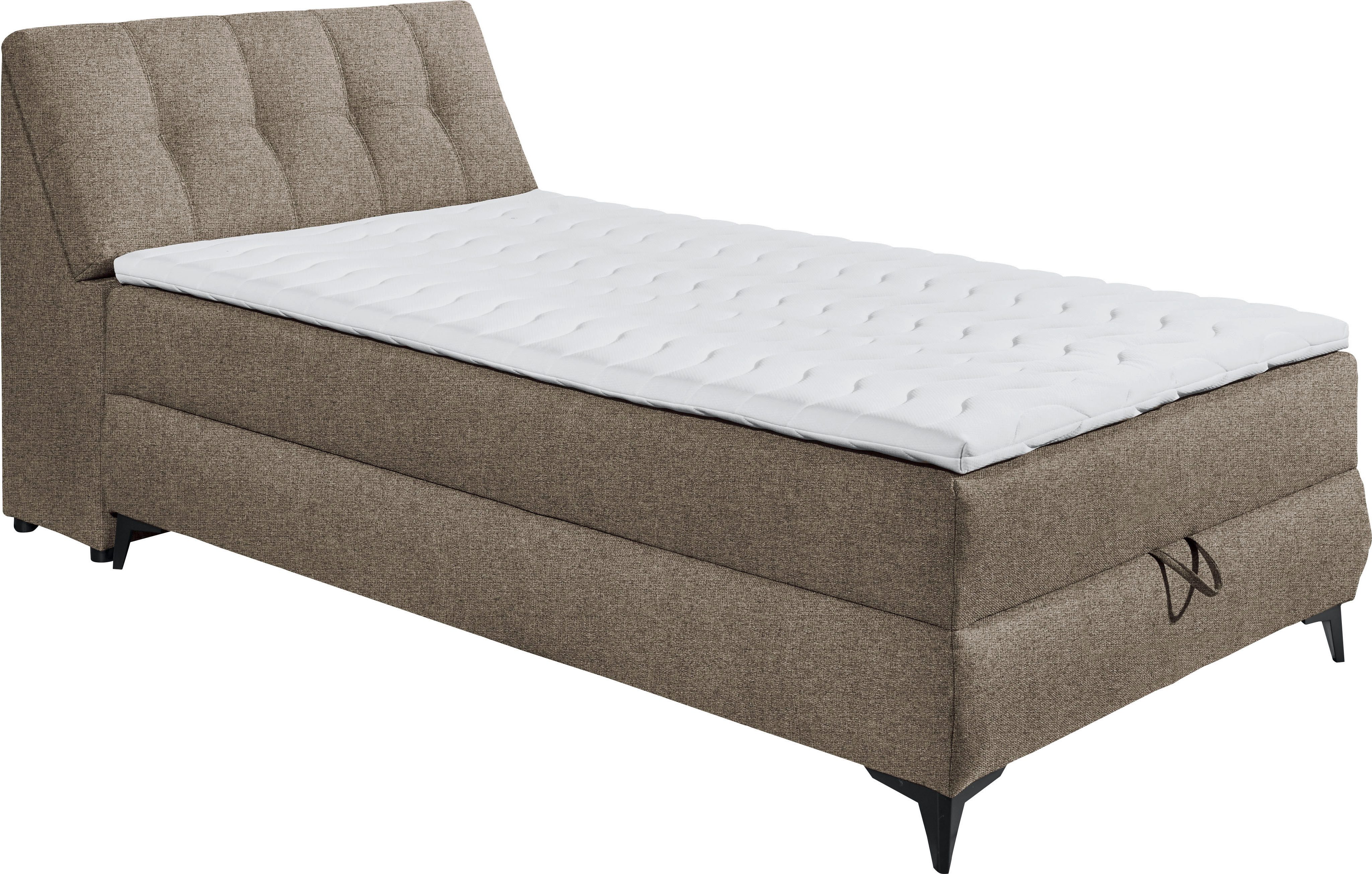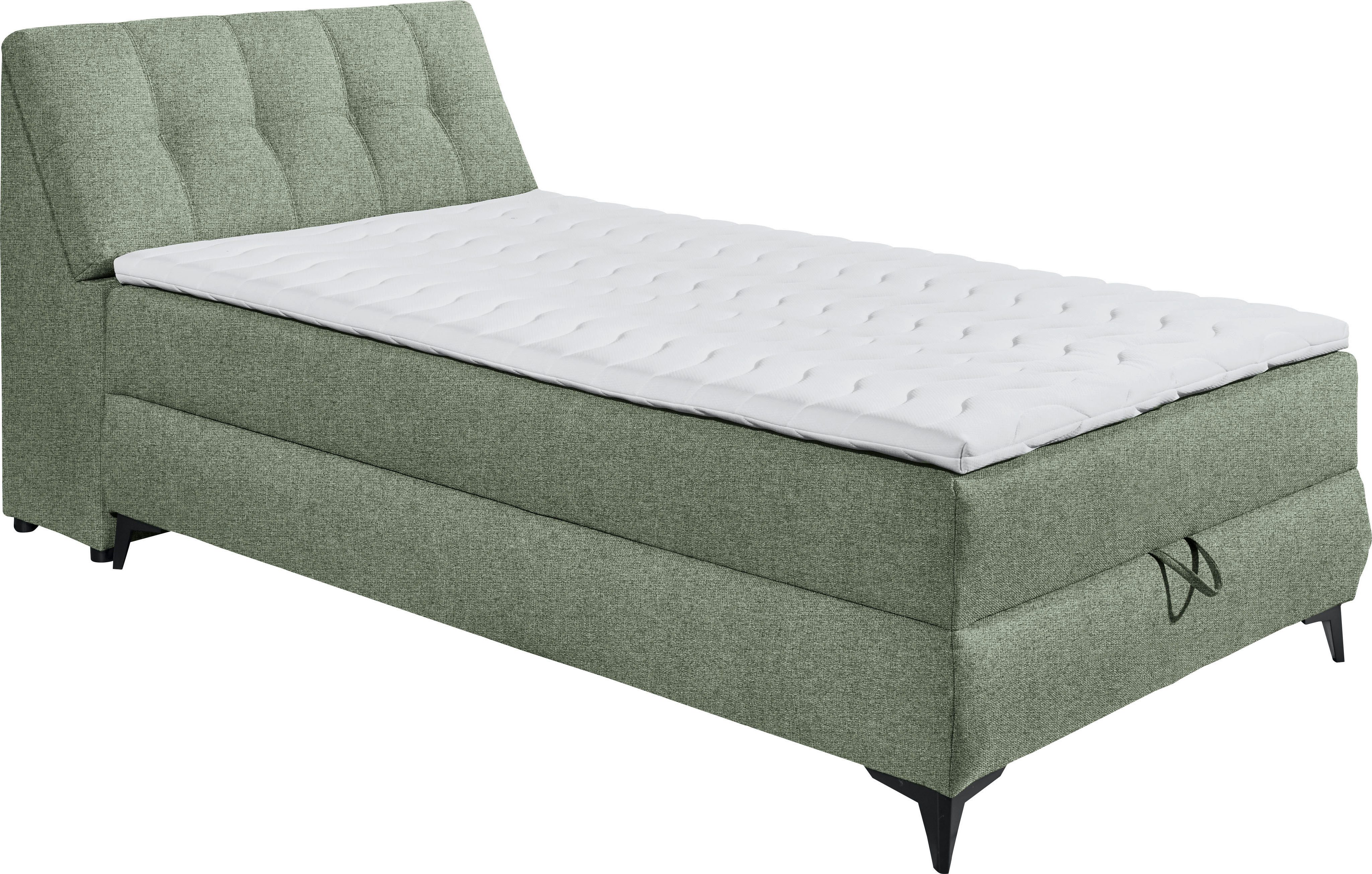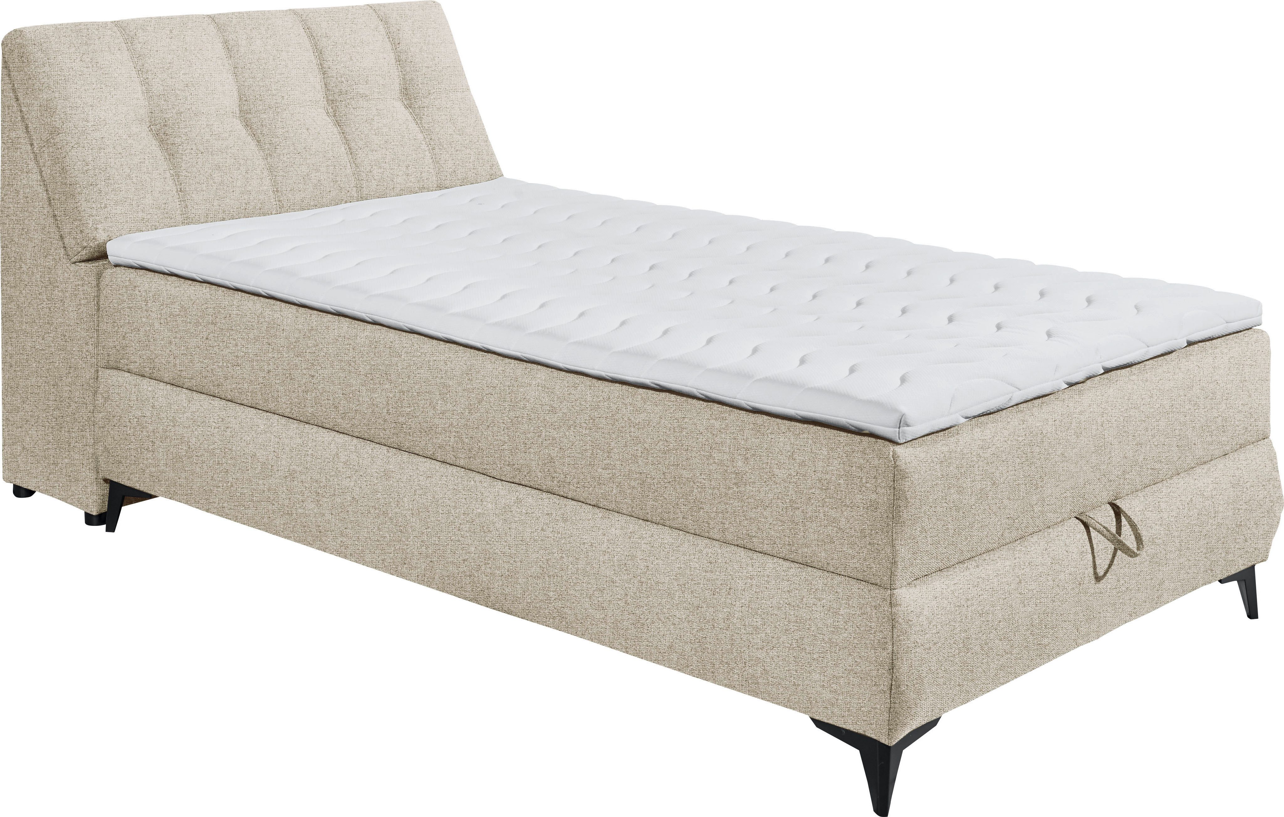 Um ein echtes Platzwunder handelt es sich bei diesem Boxbett »Atlantis« von ED EXCITING DESIGN, das mit einem Bettkasten versehen ist. Die Unterbox aus Bonnell-Federkern stützt deinen Körper gleichmäßig und sorgt für ein angenehm federndes Gefühl beim Liegen. Die maximale Belastbarkeit liegt bei einem Gewicht von 120 Kilogramm. Der Kaltschaum-Topper ist 4 cm hoch und liegt als zusätzliche Lage auf der Matratze auf. Dabei erhöht er den Schlafkomfort und rundet dein Schlafsystem ab. Das Kopfteil ist 102 cm hoch. Über das richtige Equipment für die Montage brauchst du dir keine Gedanken machen, denn das Montagematerial wird dir mitgeliefert. Bei diesem Produkt ist nur eine Teilmontage erforderlich, wodurch es mit wenig Aufwand schnell aufgebaut ist.