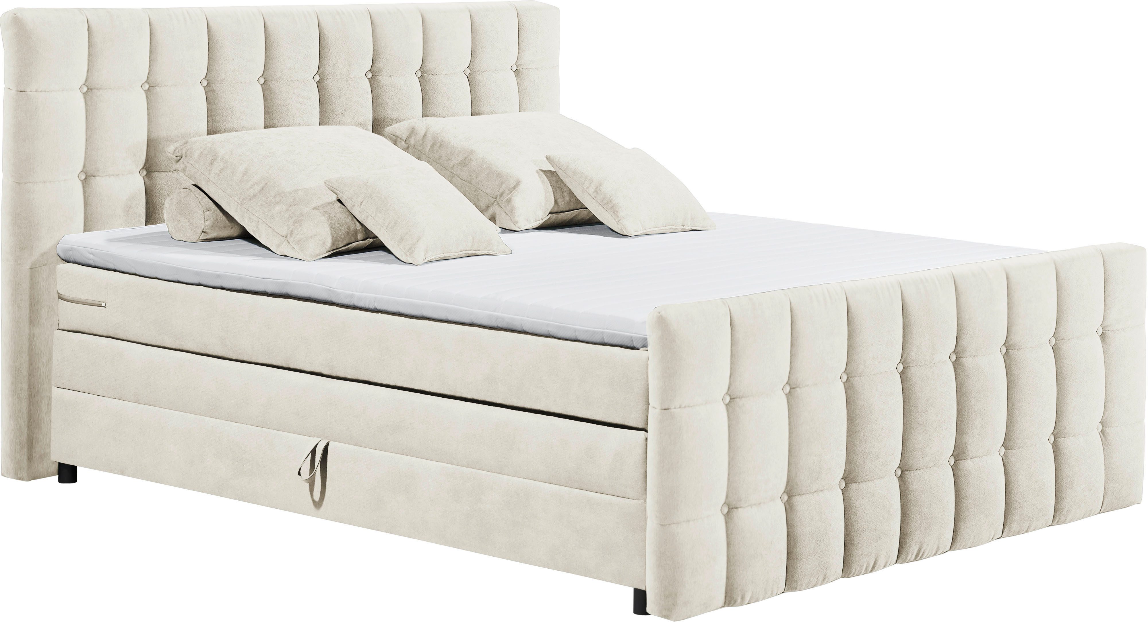 Um ein echtes Platzwunder handelt es sich bei diesem Boxspringbett »Mendoza« von ED EXCITING DESIGN, das mit praktischen Bettkästen versehen ist. Die Bonnell-Federkern-Unterbox ist flächenelastisch. Das bedeutet, dass die Federn auf der ganzen Fläche nachgeben und nicht nur an bestimmten Punkten, was für ein sehr weiches und angenehmes Liegegefühl sorgt. Beide Matratzen haben den Härtegrad H2 und sind für ein Körpergewicht bis zu 120 kg geeignet. Belastbar ist dein neues Möbelstück bis zu 120 Kilogramm. Auf den Matratzen liegt ein 6 cm hoher Kaltschaum-Topper. Er erhöht den Schlafkomfort und dient zugleich als Matratzenschutz. Das Kopfteil ist 120 cm hoch. Das Montagematerial ist im Lieferumfang enthalten, sodass du dir keine Gedanken um das richtige Werkzeug machen musst. Praktischerweise ist das Produkt teilmontiert und lässt sich schnell aufbauen.