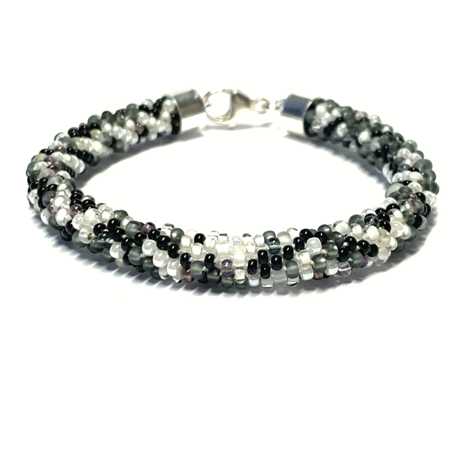 Diese Art der Schlauchketten bestehen aus 1000 en einzeln verhäkelter Glasperlen. Diese werden Perle für Perle aufgefädelt und Schlaufe für Schlaufe zurück gehäkelt. Eine echte und aufwendige Handarbeit. Dabei entstehen herrliche Armbänder für jeden Anlaß passend und zu jedem Outfit passend.
