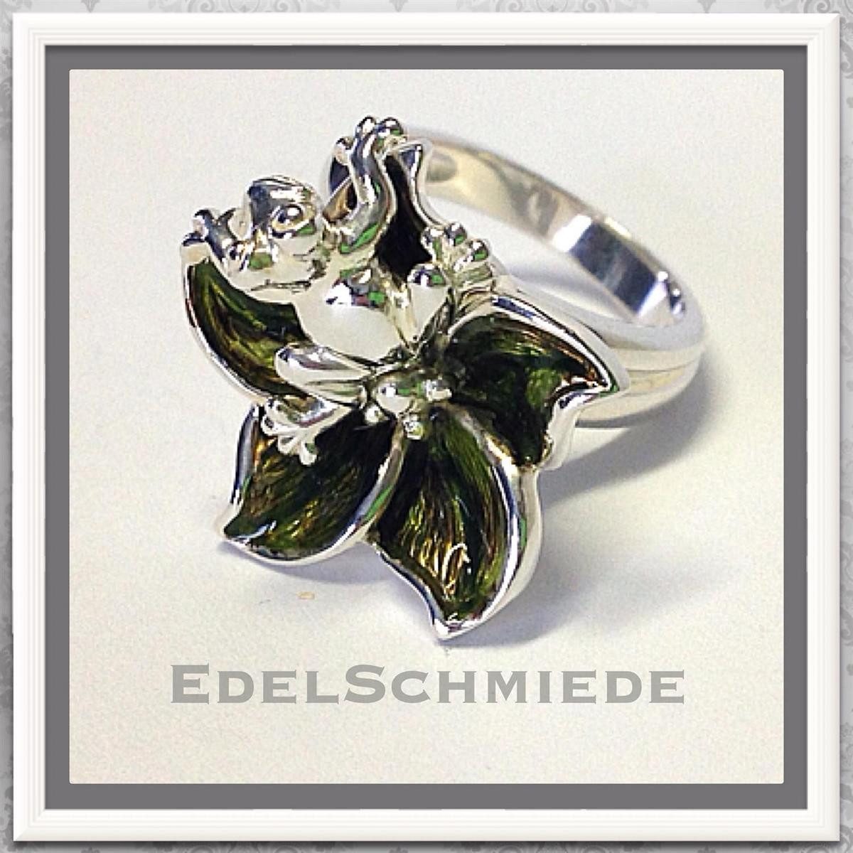 ausgefallener Fingerring in 925/- Sterling Silber mit grüner Blüte und Frosch