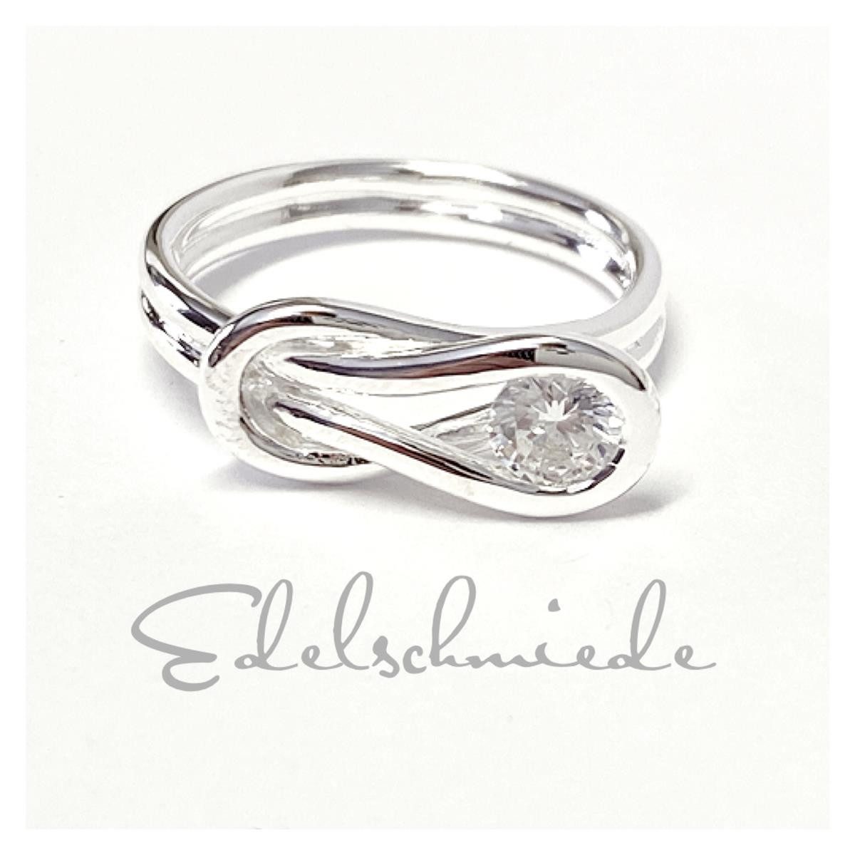 Dieser edle Fingerring ist aus 925/- Sterling Silber gefertigt. Die Schiene scheint eine Art Schlaufe zu bilden, deren Enden fest miteinander im Ringkopf verbunden sind. Gekrönt wird das Motiv mit eiem herrlich funkelnden Zirkonia.