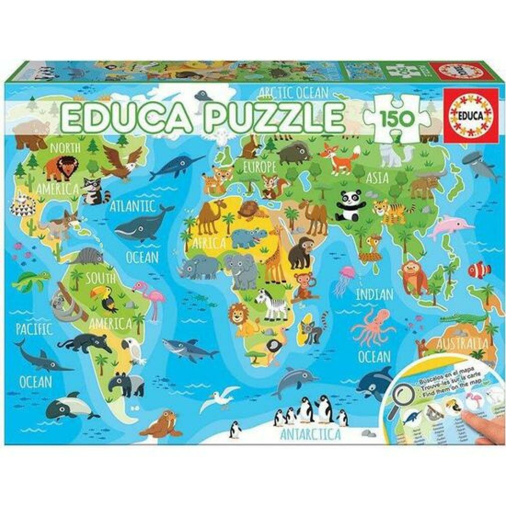 Educa 18115, Weltkarte mit Tieren, 150 Teile Puzzle für Kinder ab 6 Jahren, Landkarte, Lernpuzzle Erkunden Sie Educas Puzzle-Welt Stück für Stück! Es erwarten Sie fantasievoll gestaltete Themen voller kreativer Kunst, Gemälde, Städte, Landschaften, Tiere und Filmhelden. Unsere Puzzles sind zu verschiedenen Themen für Babys, Kinder und Erwachsene konzipiert und gestaltet. Mit unserem umfangreichen ?Aesthetic Range? kommt Ihr Puzzlespaß auf die nächste Stufe. schwer zu vergessen. Vielfalt EDUCA Puzzle World bietet eine breite Palette an Themen für alle Altersgruppen und Interessen. Hierzu zählen auch beliebte Lizenzprodukte. Unterschiedlich viele Rätsel begleiten die Rätselbegeisterung für Anfänger, Fortgeschrittene und Profis. Innovation Wir wissen, dass der beste Weg, die Bedürfnisse unserer Kunden zu erfüllen, darin besteht, uns jeden Tag neu zu erfinden. Dieses Ziel hat unser Team aus Produktentwicklern, Designern, Pädagogen und Spieleexperten stets vor Augen. Begeisterung für das Lösen von Rätseln Für alle EDUCA-Puzzles mit 3000 Teilen oder mehr sendet EDUCA alle beim Zusammenbau verlorenen Puzzleteile an Ihre Privatadresse, solange der Vorrat reicht. Für alle Puzzles mit 500 bis 2.000 Teilen erhalten Sie den speziellen FIX PUZZLE-Kleber, damit Sie Ihr fertiges Puzzle aufhängen können. Qualität und Sicherheit EDUCA steht für Qualität. Dies ist eine der Eigenschaften, die Verbraucher mit unseren Produkten verbinden. Unsere Produkte werden in unserer Fabrik in Barcelona (Spanien) hergestellt. Unsere Puzzles sind präzise gestanzt, sodass alle Teile perfekt zusammenpassen. Puzzles werden mit hochwertigen Drucktechniken und erstklassigen Rohstoffen hergestellt.