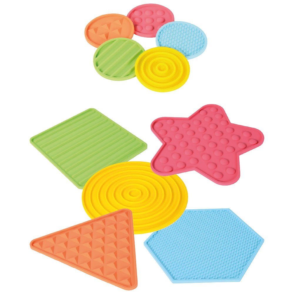 ... Ringförmig, gestreift, gepunktet - mit geschlossenen Augen (oder Augenbinde) wählt man eine kleine runde Silikonscheibe aus dem Säckchen aus. Nachdem man die Oberfläche mit den Fingern erfühlt hat, versucht man mit den Füßen die gleiche Struktur auf einer großen Bodenmatte wieder zu finden. Beim Öffnen der Augen sieht man ob die erfühlten Strukturen und Farben der kreisförmigen Scheiben identisch sind. Das Fühlspiel fördert die persönliche, soziale und emotionale Entwicklung der Kinder, stärkt ihr Selbstvertrauen und Selbstbewusstsein. Die starken und zugleich weichen Silikonmatten sind rutschfest und lassen sich einfach mit Wasser oder in der Geschirrspülmaschine reinigen. Set bestehend aus: 5 große und 5 kleine Silikonmatten, 1 Säckchen.