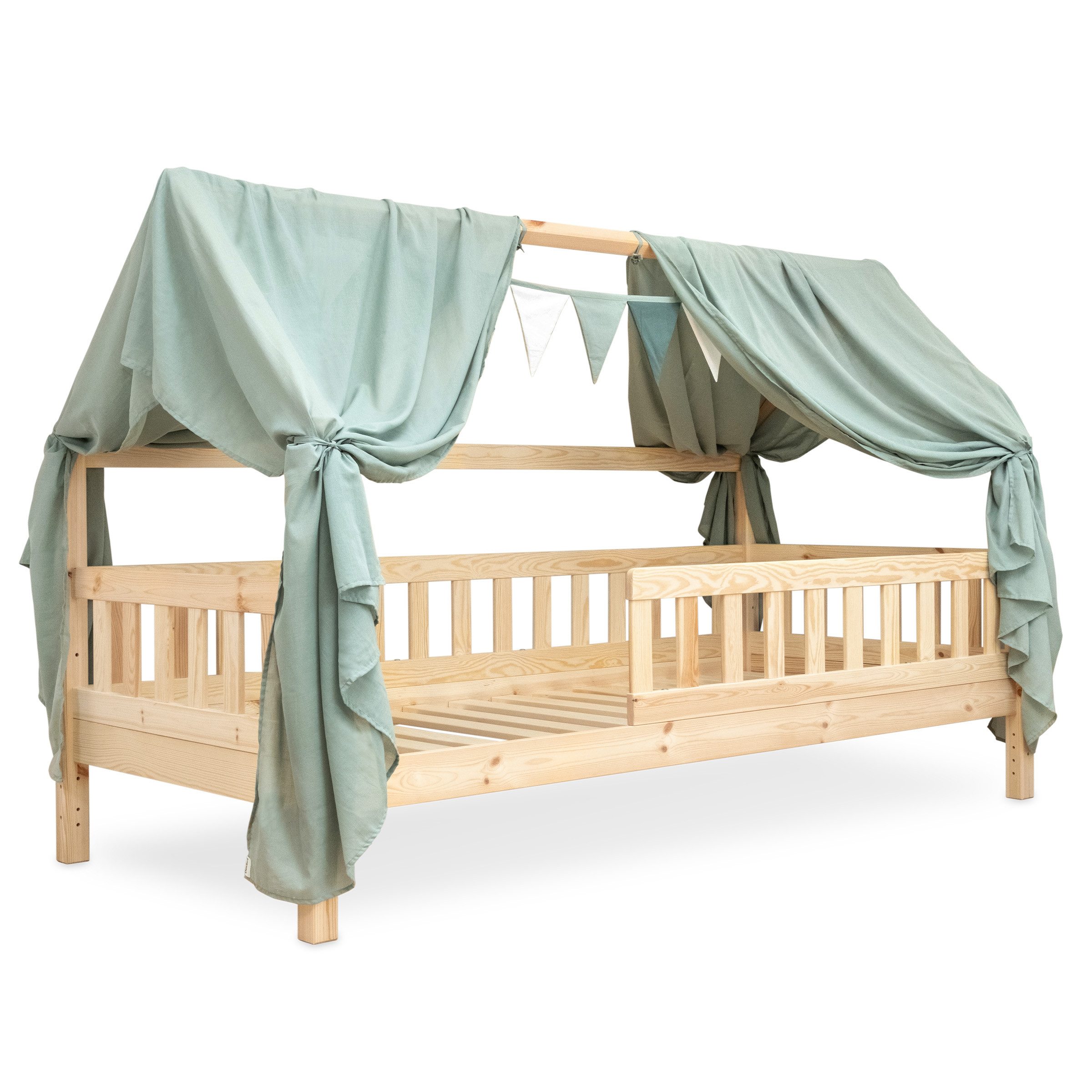 Das Set ist besonders geeignet für Hausbetten, kann aber flexibel auch für andere Betten oder Dekorationszwecke genutzt werden, um den Raum optisch aufzuwerten. Durch die praktischen Befestigungsschlaufen sind die Vorhänge leicht zu handhaben und einfach zu installieren. Farblich passt der Betthimmel perfekt zu unserer Kinderbettwäsche und ist in Beige, Hellgrau, Jade und Rosé erhältlich.